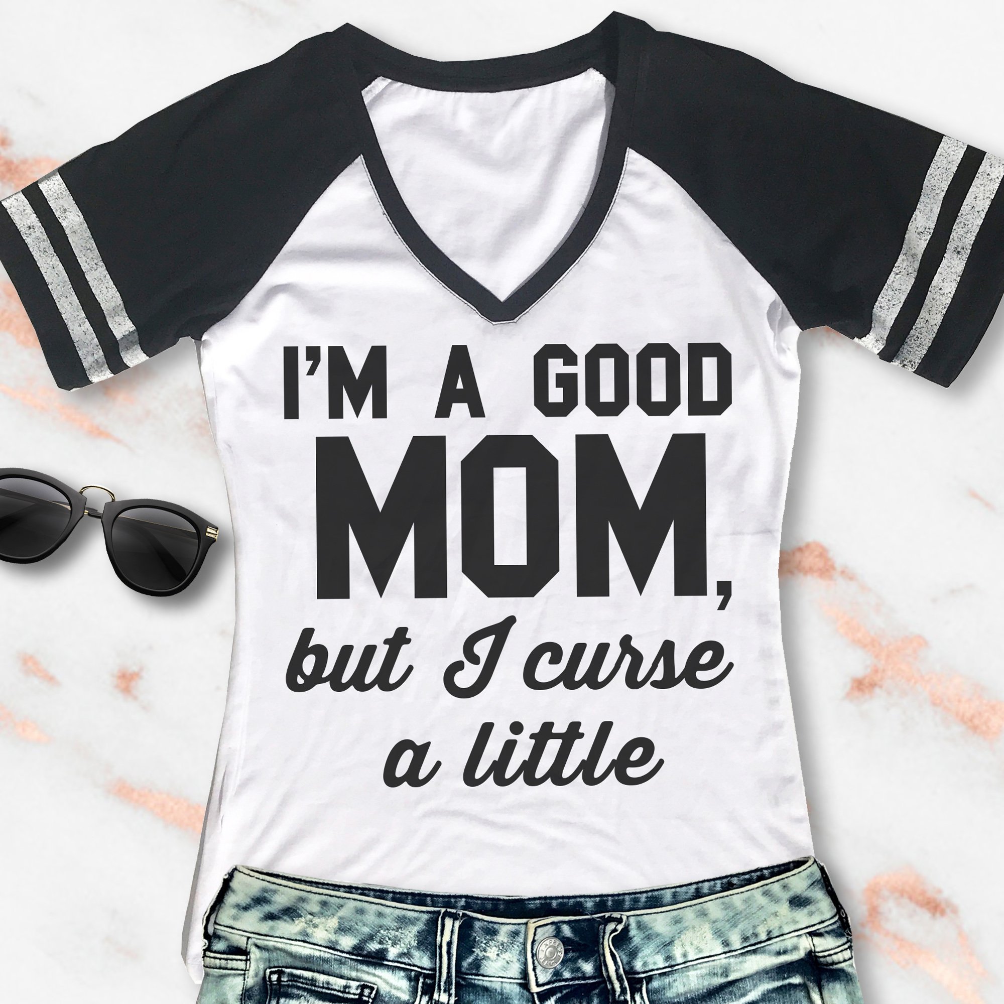A stylish women's V-neck shirt featuring the phrase 'I'm a Good Mom, but I curse a little', available in black with gray sleeves and white with black sleeves.