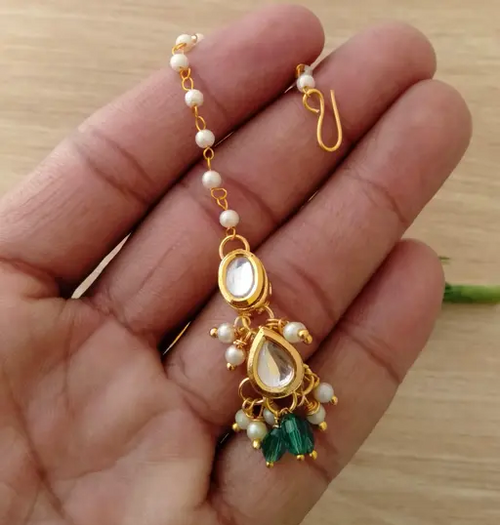 This beautifully crafted accessory is a true celebration of elegance and tradition. Made with the finest Kundan stones and delicate pearls, it exudes timeless charm and grace. Adorn your forehead with this maangtikka and experience the enchantment it brings to your look. The Kundan stones, known for their lustrous appeal, are intricately arranged in a captivating design, while the pearls add a touch of sophistication. The combination of these elements creates a stunning piece that effortlessly enhances your beauty.