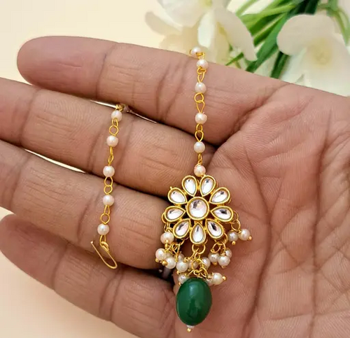 This beautifully crafted accessory is a true celebration of elegance and tradition. Made with the finest Kundan stones and delicate pearls, it exudes timeless charm and grace. Adorn your forehead with this maangtikka and experience the enchantment it brings to your look. The Kundan stones, known for their lustrous appeal, are intricately arranged in a captivating design, while the pearls add a touch of sophistication. The combination of these elements creates a stunning piece that effortlessly enhances your beauty.