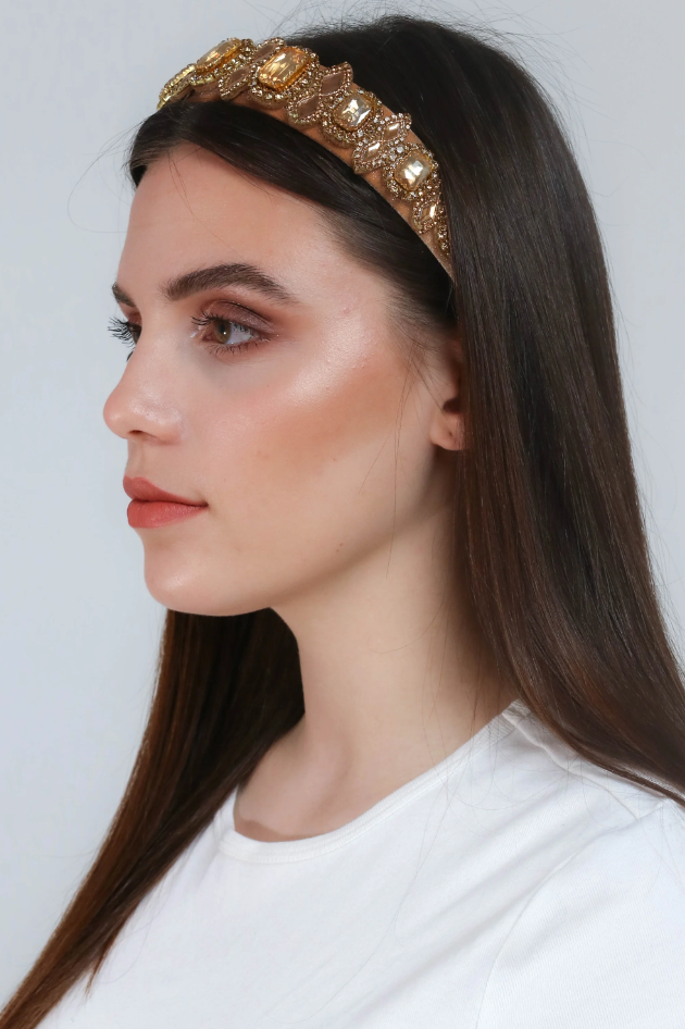 Brown hairbend ART2231 with decorative details, made from 100% polyester, showcasing its elegant design.