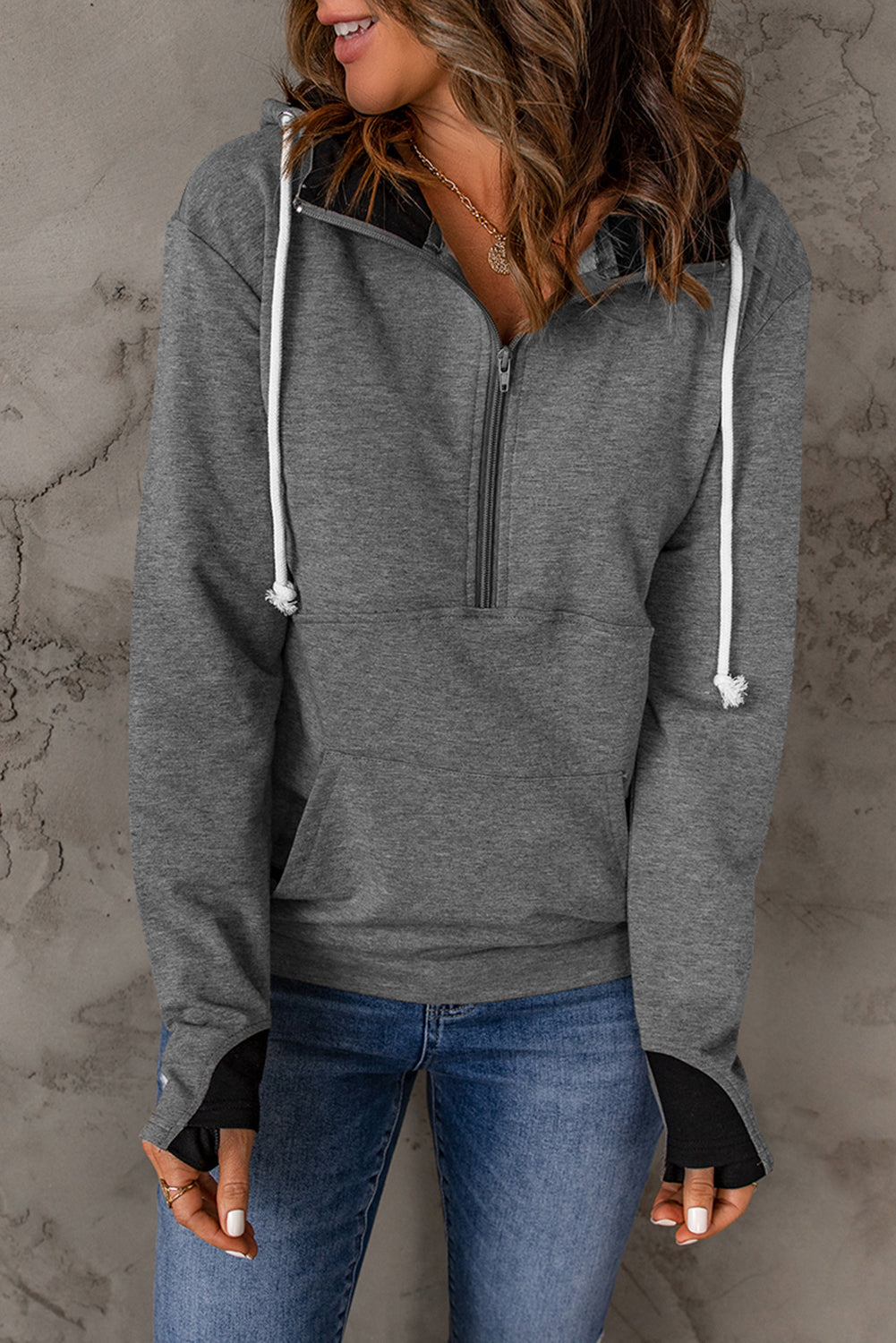 The Half Zip Drawstring Detail Thumbhole Sweatshirt is incredibly versatile. Pair it with your favorite jeans for a casual day out, or wear it over leggings for a cozy at-home look. You can also layer it under a jacket for added warmth during chilly weather. The minimalist design allows you to accessorize easily, whether with a statement necklace or a simple scarf.