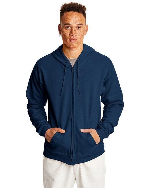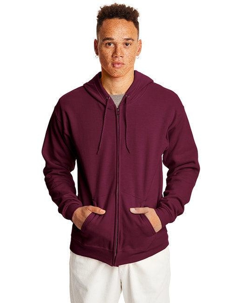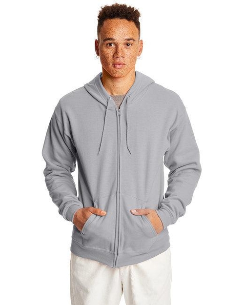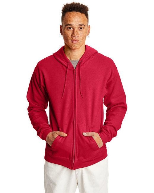 7.8 oz.; 50% cotton (up to 7.7% reclaimed), 50% polyester (up to 7.7% recycled); Recycled polyester from plastic water bottles; Patented, low-pill, high-stitch density PrintPro XP fabric; Single-ply hood; Dyed-to-match drawcord; Triple-needle top coverstitching along cuffs, waistband, pockets and hood; Full-zip front with pockets; rib knit waistband and cuffs; Tag-free neck label transitioning to tear-away label. INVENTORY MAY BE MIXED; "A-" list status from CDP (Carbon Disclosure Project); Energy Star Partner of the Year (14 consecutive years); Every piece of Hanes apparel purchased from our company qualifies for Hanes4Education