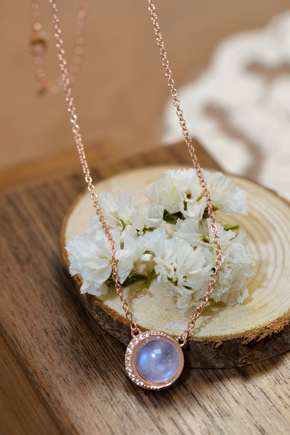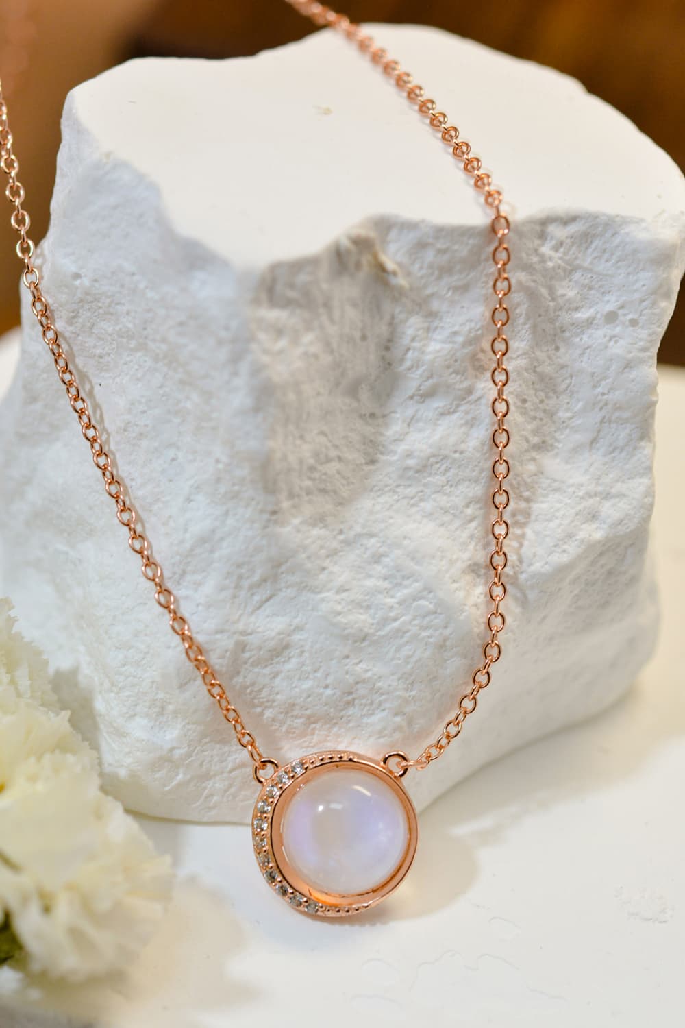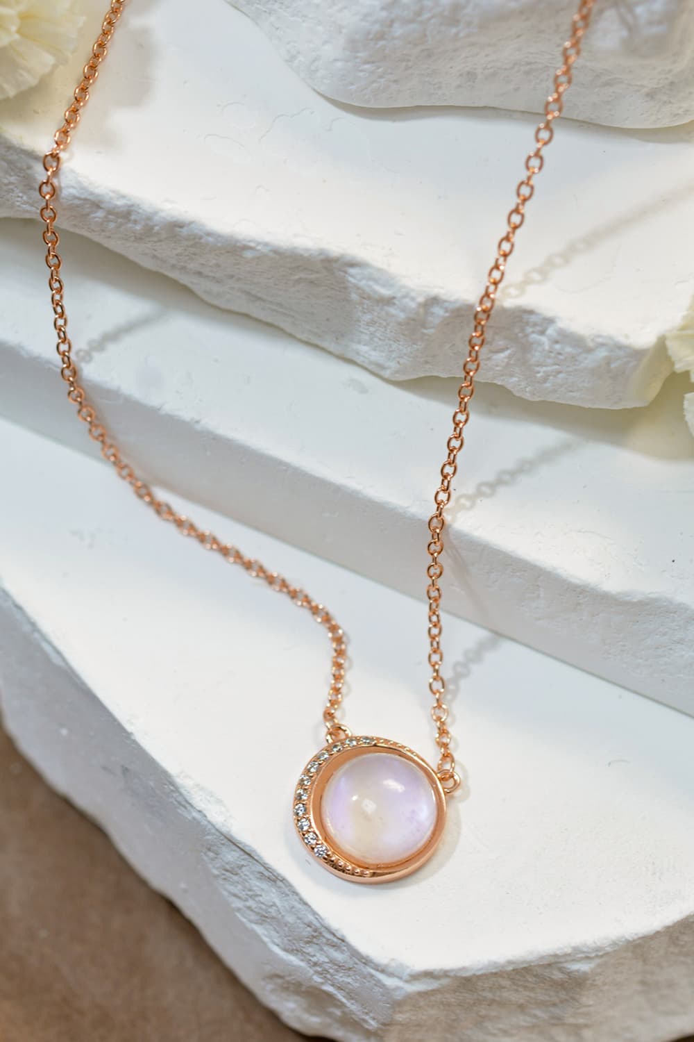 This jewelry is made from high-quality 925 sterling silver, which is then elegantly plated with 18K rose gold. The combination of these materials not only enhances the aesthetic appeal but also ensures durability and longevity. The addition of zircon further elevates the design, providing a sparkling contrast to the natural moonstone.
