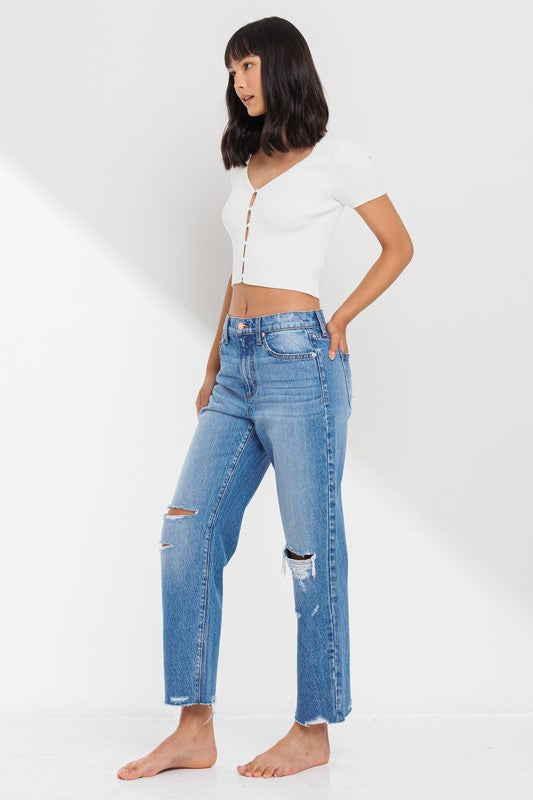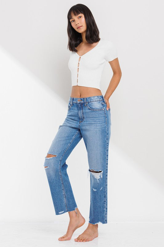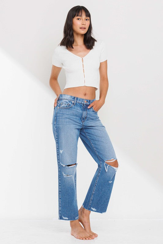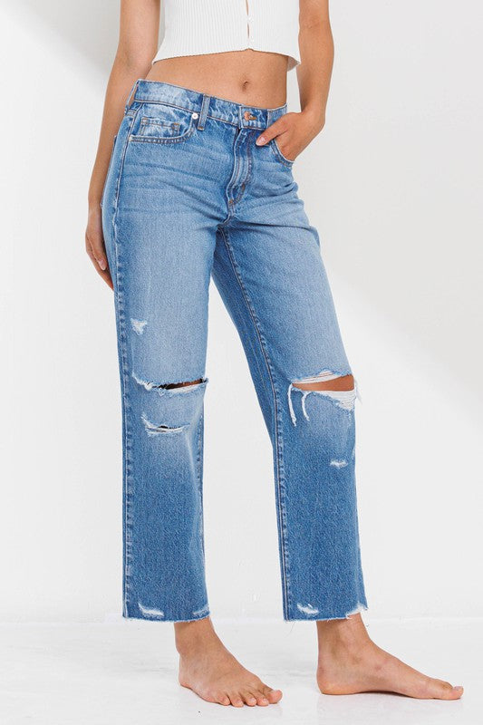 Crafted from high-quality denim, these jeans are built to last. The fabric is soft yet durable, providing the perfect balance of comfort and longevity. The knee destruction detail adds an element of style while ensuring that you remain comfortable throughout the day. Whether you're running errands or enjoying a night out, these jeans will keep you looking chic.