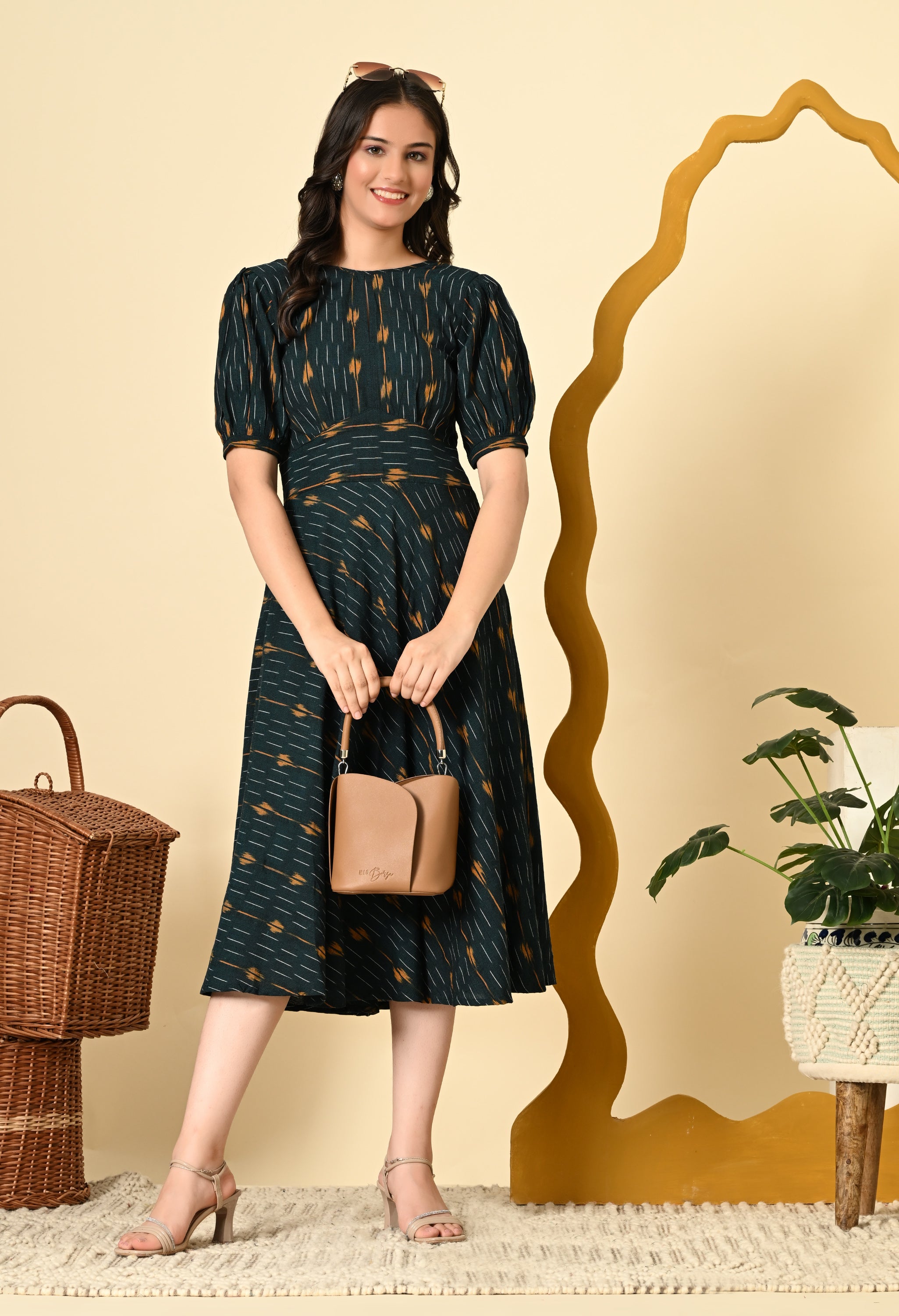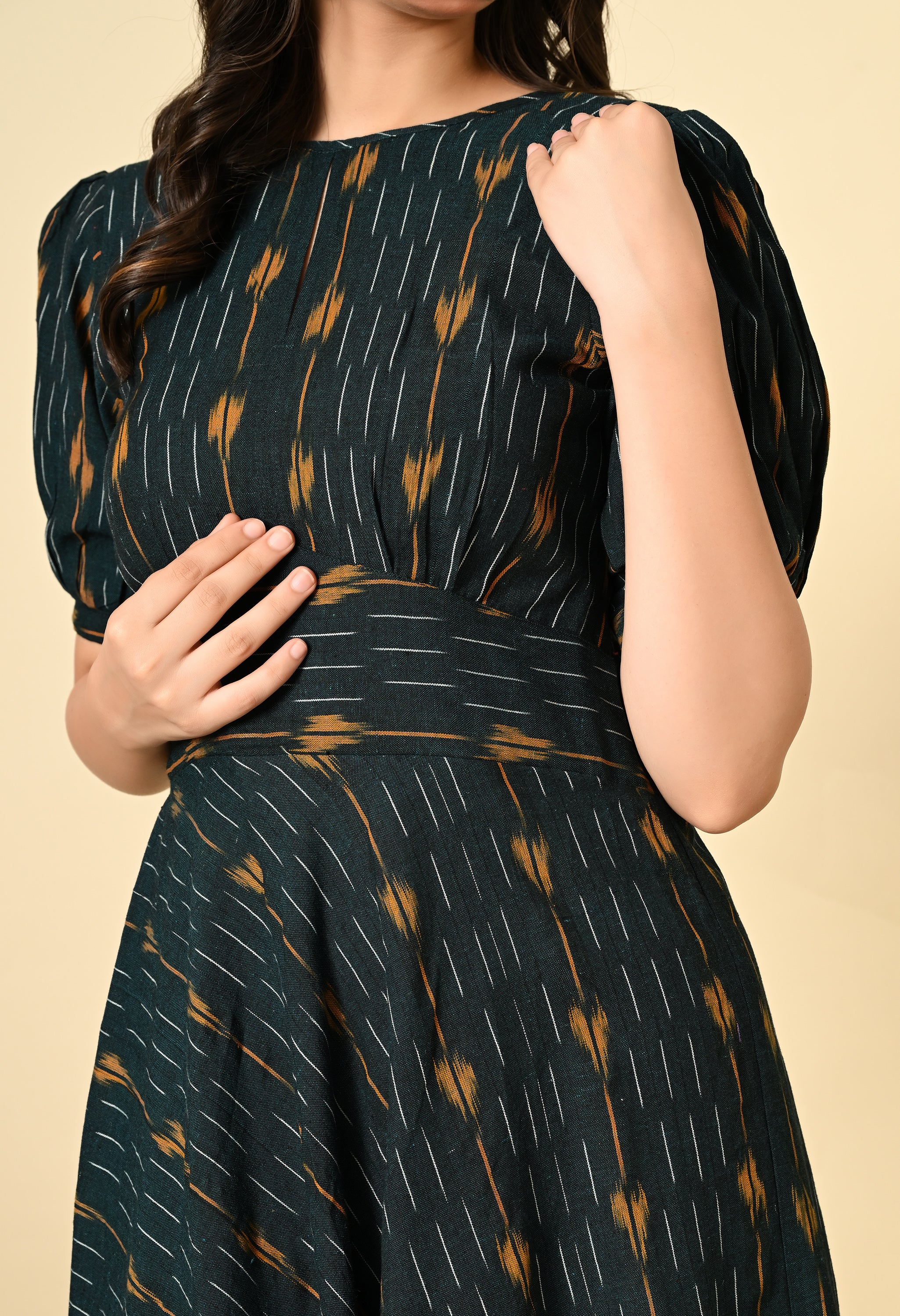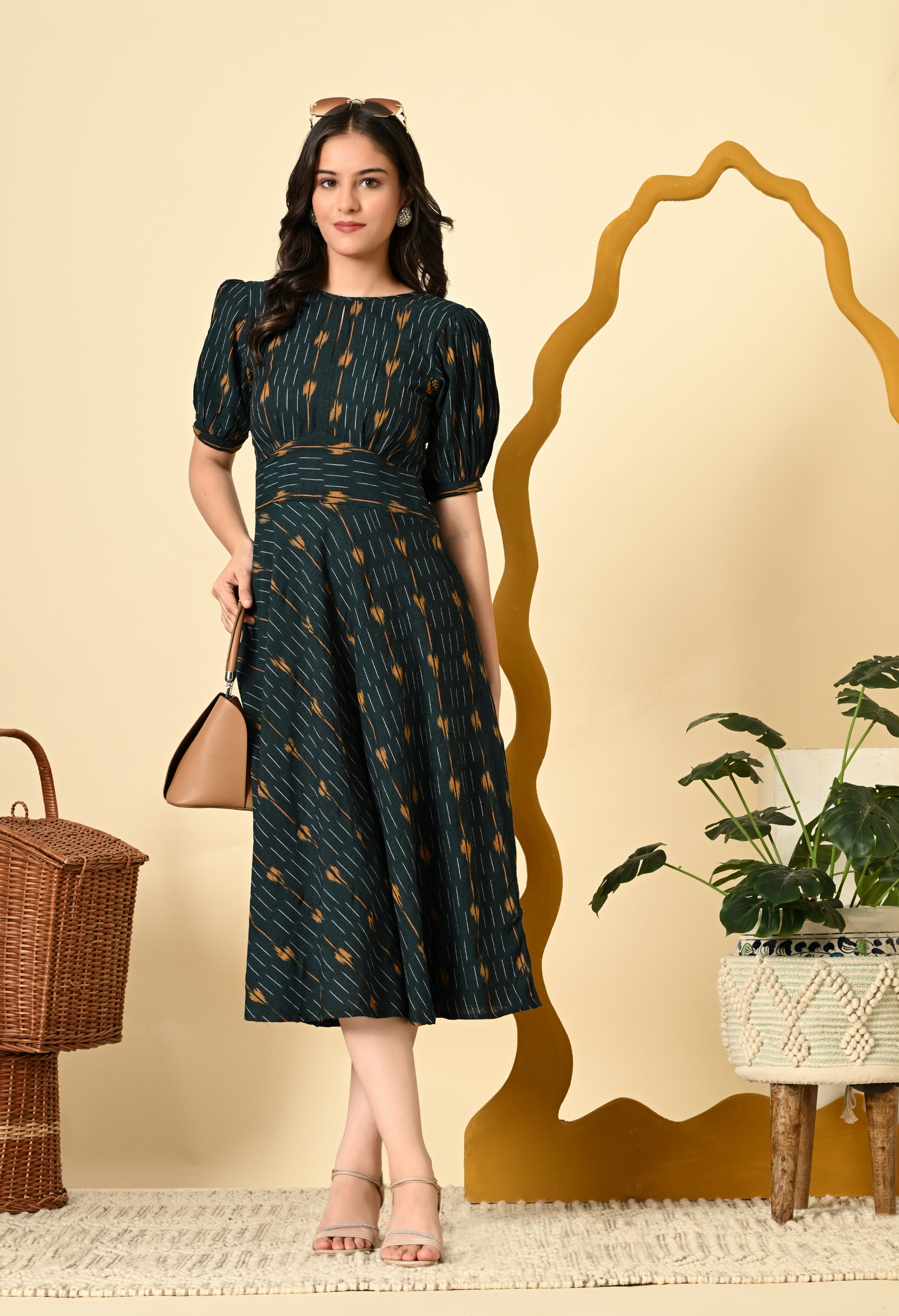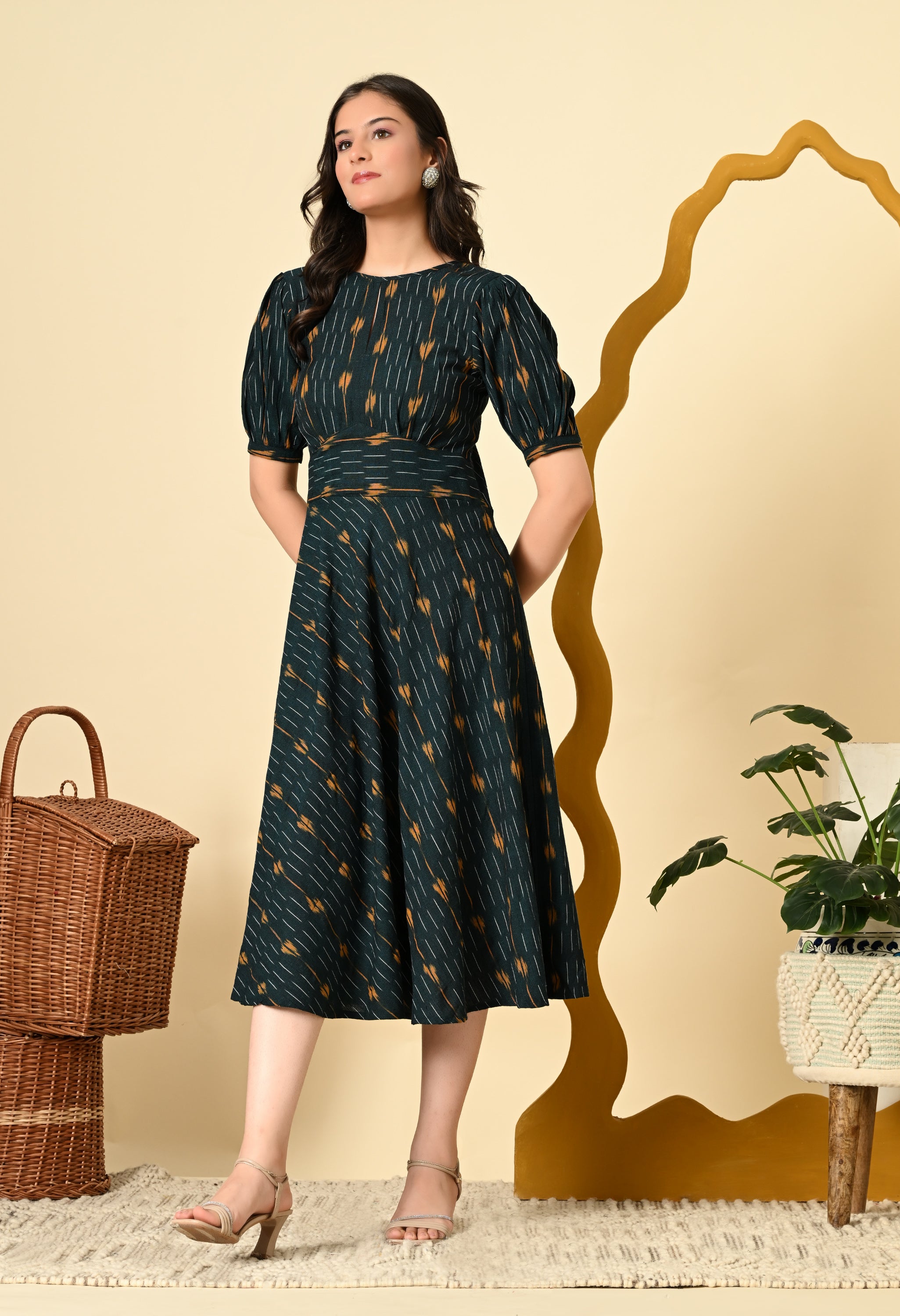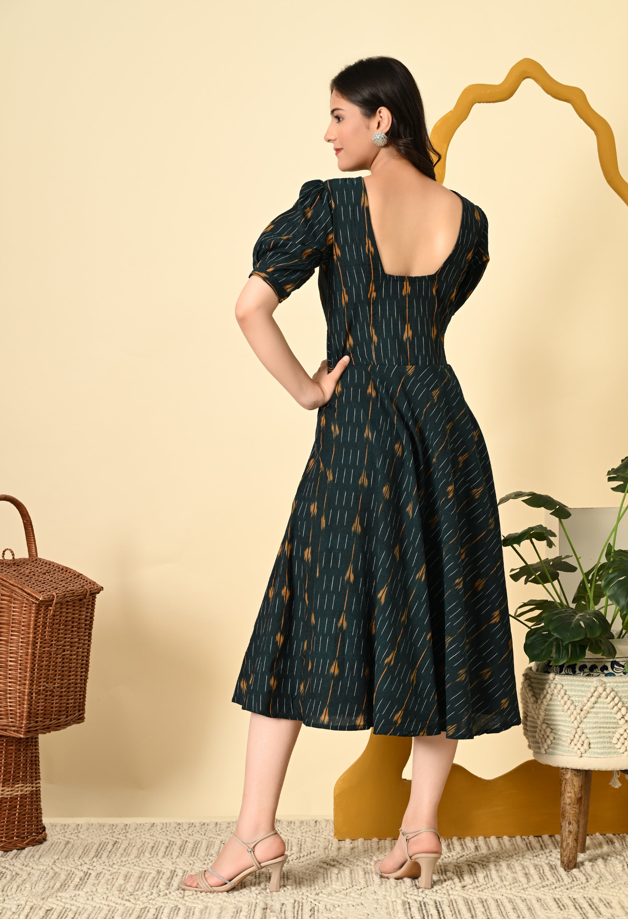 The dress showcases a beautiful Ikat pattern, known for its intricate designs and vibrant colors. The green hue adds a refreshing touch, making it perfect for spring and summer outings. The round neck in the front and square back design create a unique look that stands out. The fit-and-flare style ensures that you feel comfortable while looking chic.