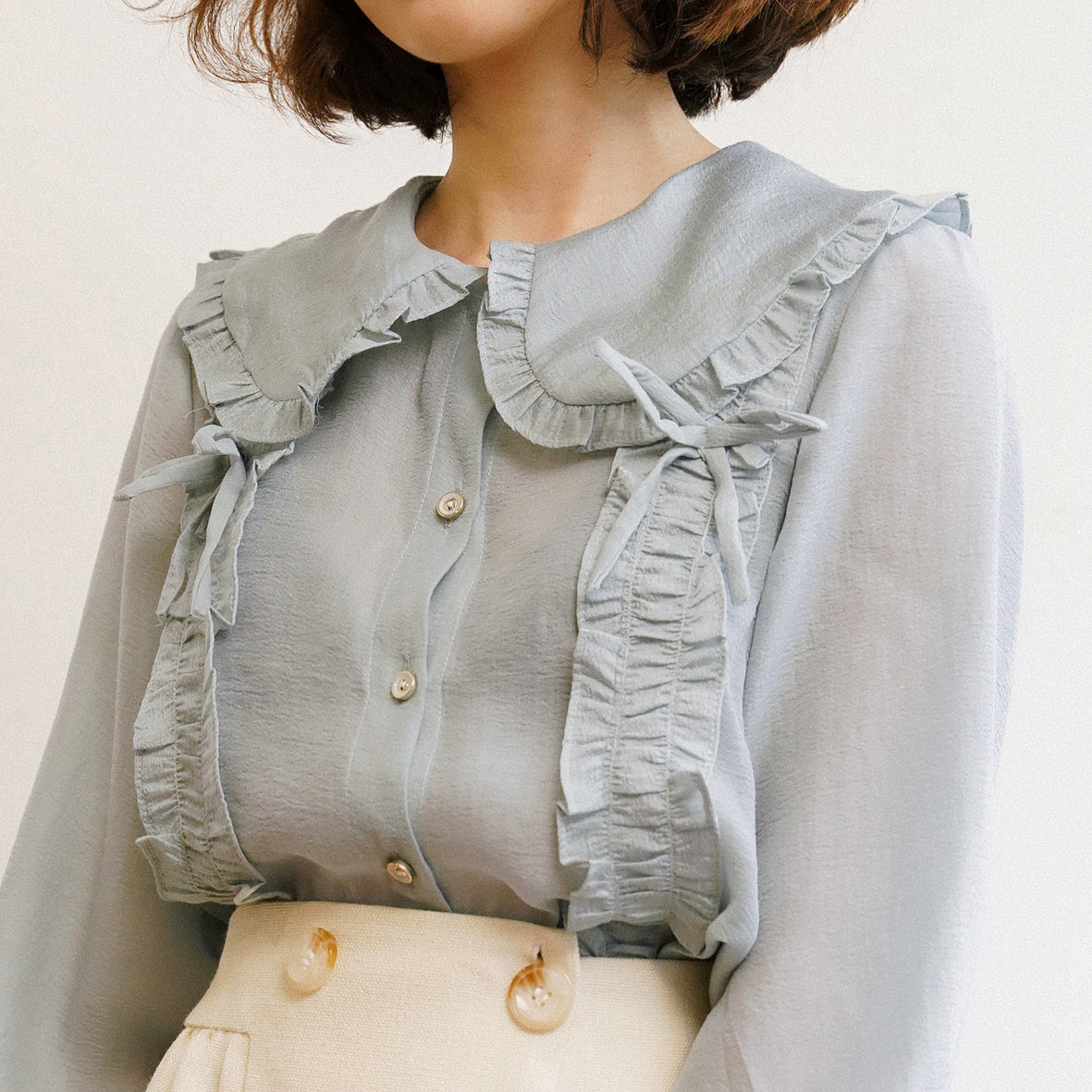 Elegant Hina Shirt made of soft silk with ruched bodice and bow detail, perfect for summer wear.