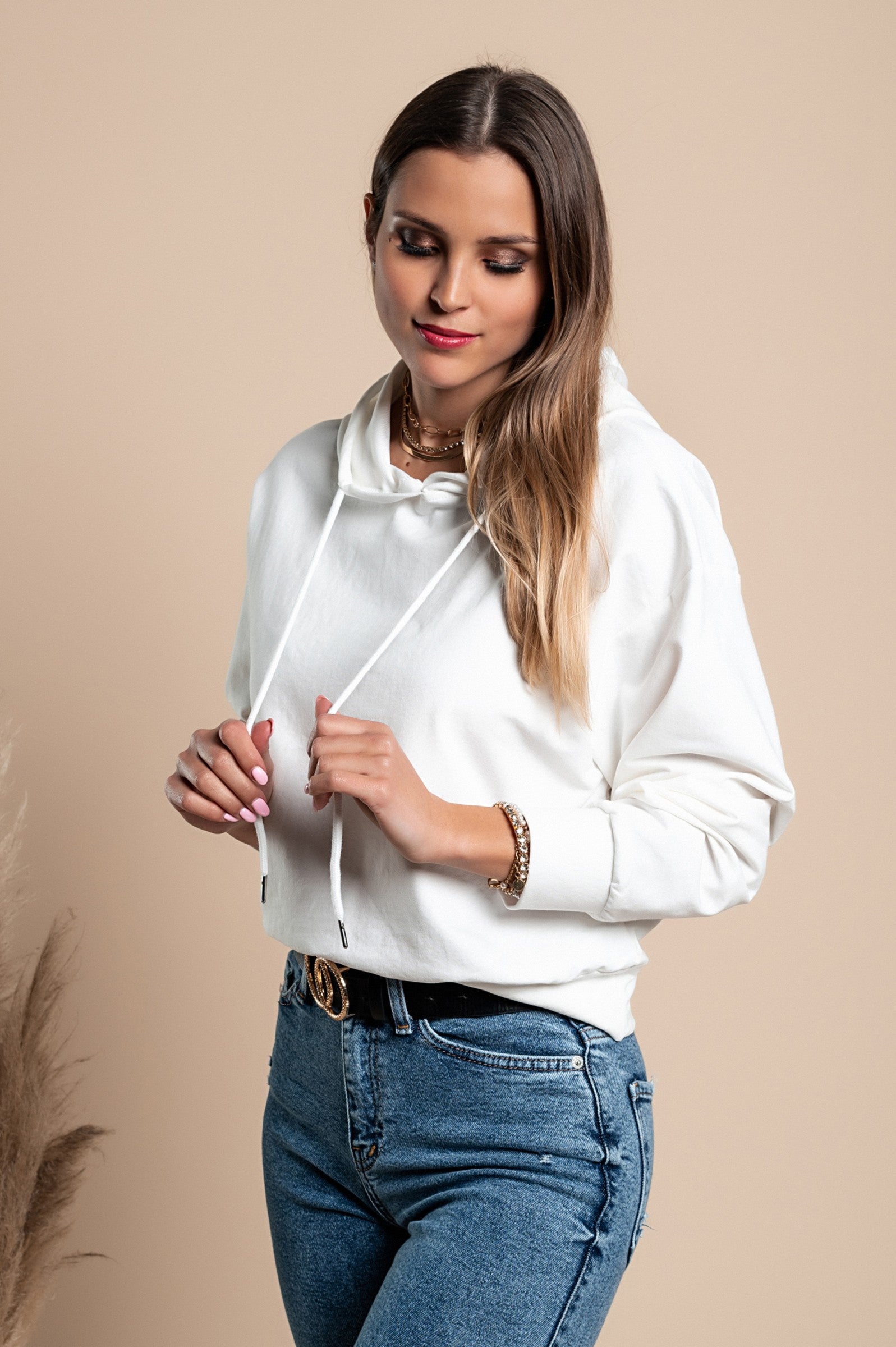 The Rionna Hooded Sweatshirt is designed to be paired with a variety of outfits. Whether you choose to wear it with joggers for a sporty look, jeans for a casual outing, or even layered over a dress for a trendy ensemble, this sweatshirt adapts to your style. Its classic white color makes it easy to match with any wardrobe, ensuring you always look effortlessly chic.
