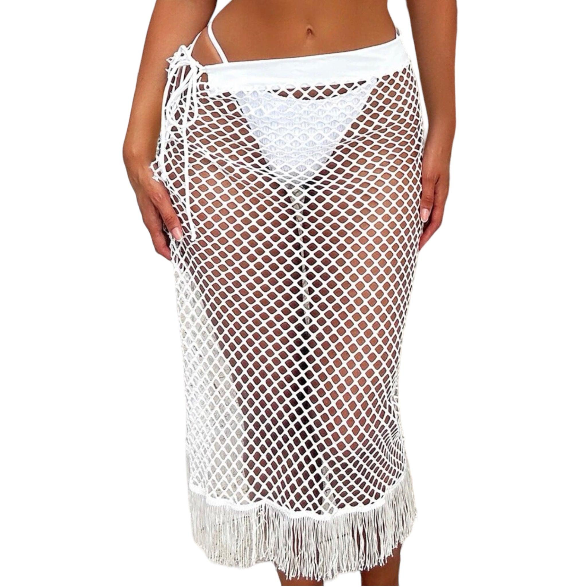The cover-up features a chic hollow-out design that adds a touch of elegance to your beach attire. The trendy fringe and knot details enhance its visual appeal, making it a perfect choice for those who want to stand out by the pool or on the beach. The sheer fabric allows for a glimpse of your swimwear underneath, creating a playful yet sophisticated look.