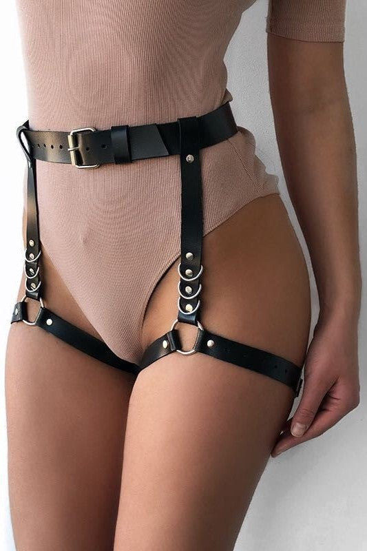Introducing our stunning imitation leather harness belt with metal rings, designed to elevate your fashion game. This black body belt is crafted from high-quality imitation leather, ensuring both style and durability. Whether you're dressing up for a night out or adding flair to your everyday look, this harness belt is the perfect accessory.