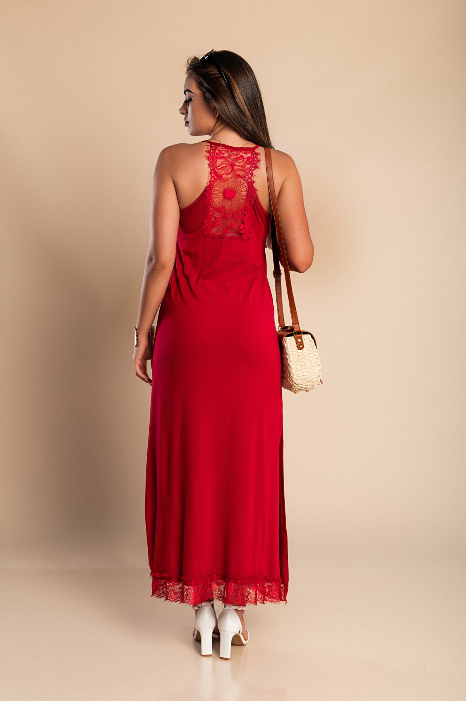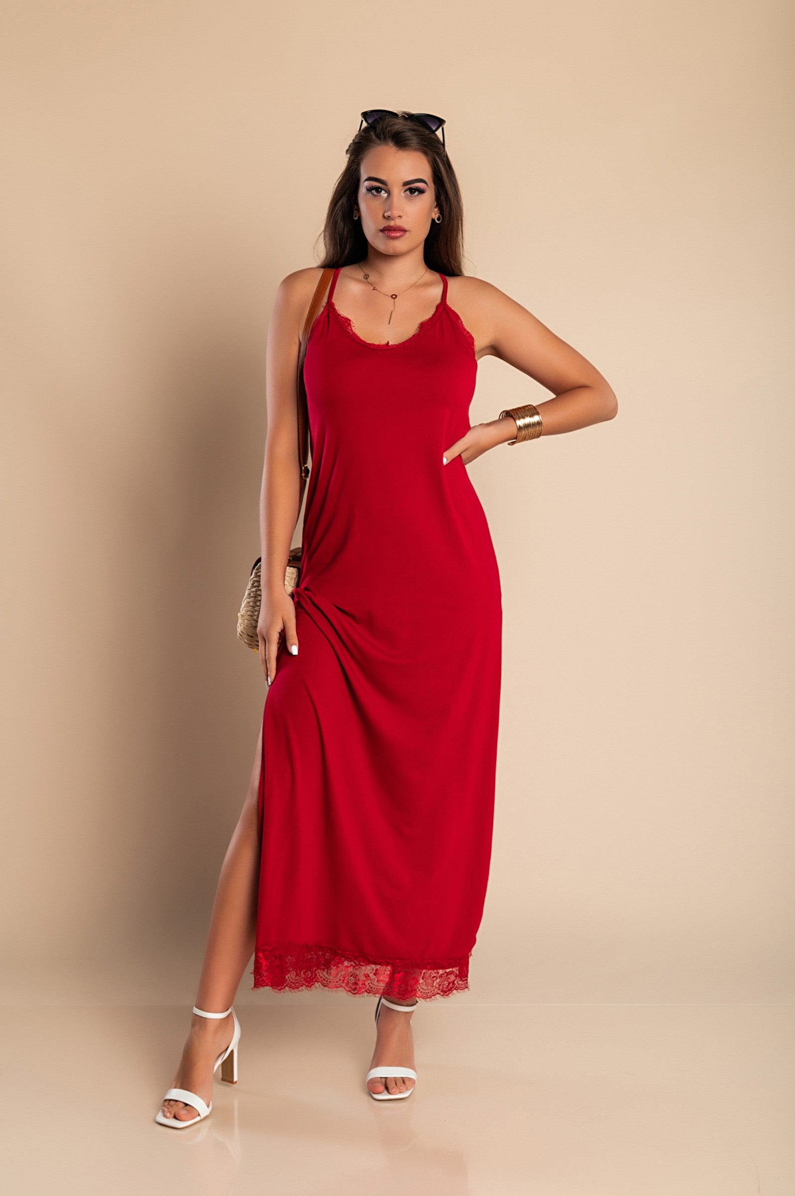 Odkrijte čarobnost čipkaste maxi obleke Primarosa v elegantni bordo barvi. Ta obleka je izdelana iz lahkega in prijetnega blaga, kar jo naredi idealno izbiro za poletne dni ali posebne priložnosti. Obleka je zasnovana z odprtim ramenskim predelom, kar dodaja pridih ženstvenosti in elegance. Čipkasti detajli na sprednji in zadnji strani ter na spodnjem delu obleke prinašajo dodatno noto sofisticiranosti.