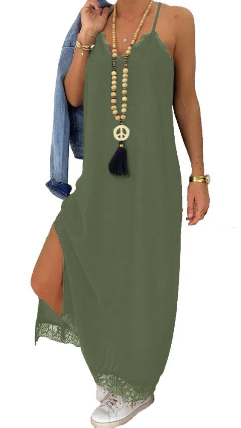 Odkrijte čipkasto maxi obleko Primarosa v olivni barvi, ki je popolna izbira za vsako priložnost. Ta obleka je izdelana iz lahkega in prijetnega blaga, kar zagotavlja udobje skozi ves dan. Z odprtim ramenskim predelom in elegantnim 'V' izrezom, je obleka zasnovana tako, da poudari vašo postavo in doda pridih ženstvenosti.