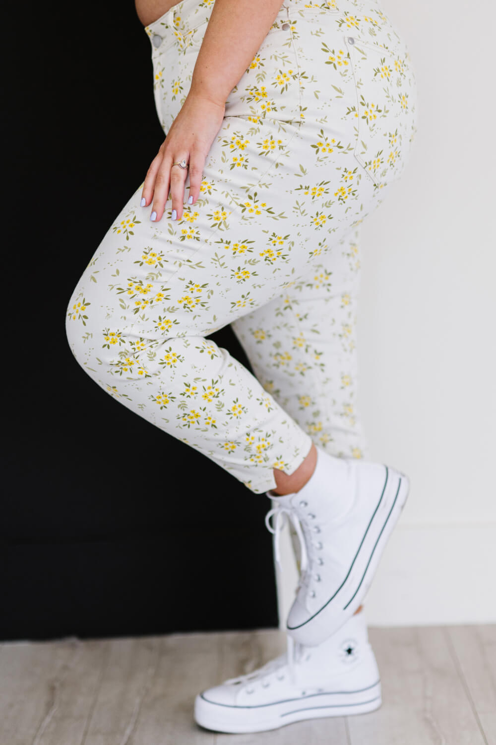 The floral pattern on these skinny jeans is not just eye-catching but also versatile. Pair them with a yellow top to enhance the cheerful vibe or mix and match with other colors for a unique look. The floral design is perfect for casual outings, brunches, or even a day at the park, making these jeans a must-have addition to your spring wardrobe.