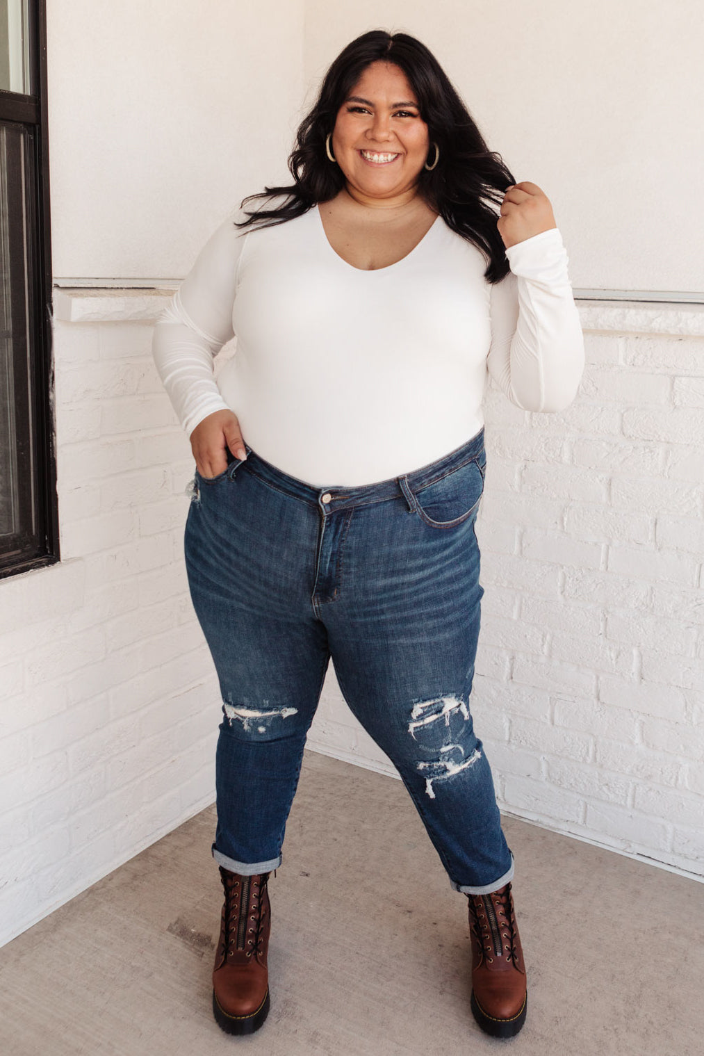 The Judy Blue Mid-Rise Thermal Boyfriend Jeans are available in a wide range of sizes, ensuring that every woman can find her perfect fit. The sizes range from 0/24 to 24W, with detailed measurements provided for each size to help you choose the best option. The model Tiana is wearing a size 1/25, while model Ivana showcases the size 20W, demonstrating the flattering fit across different body types.