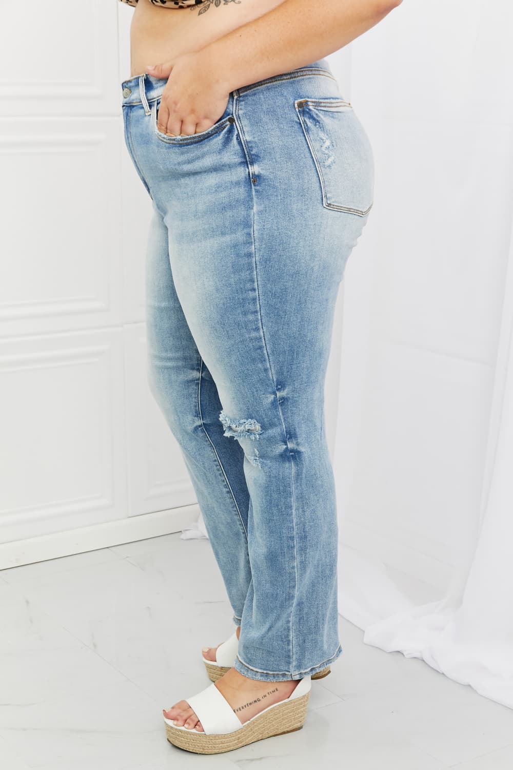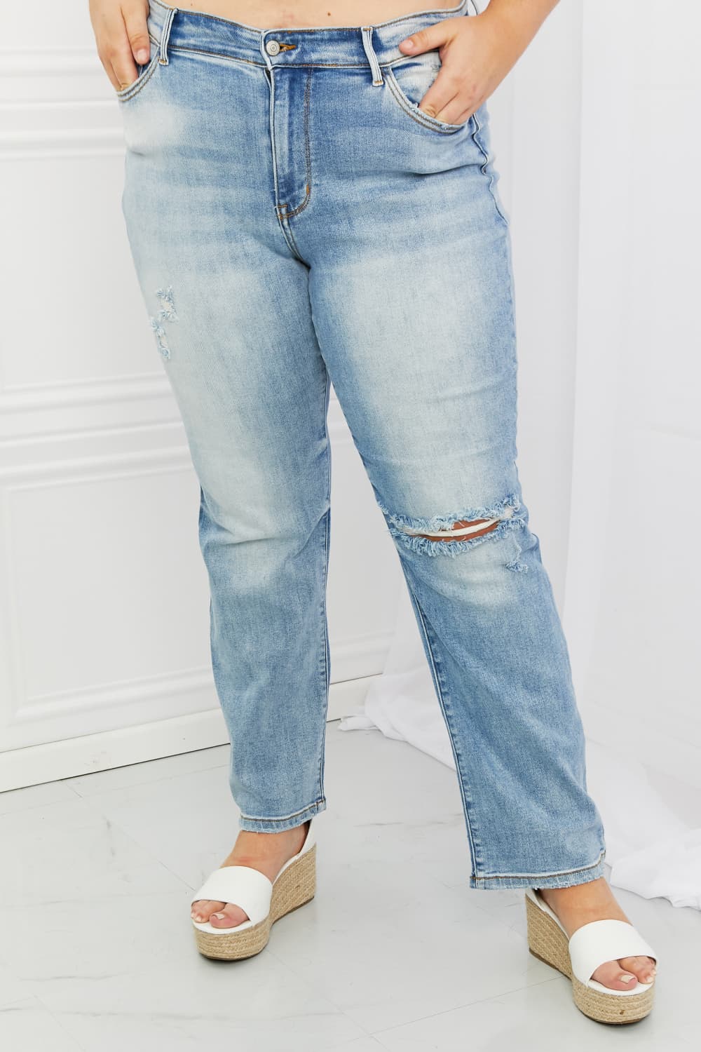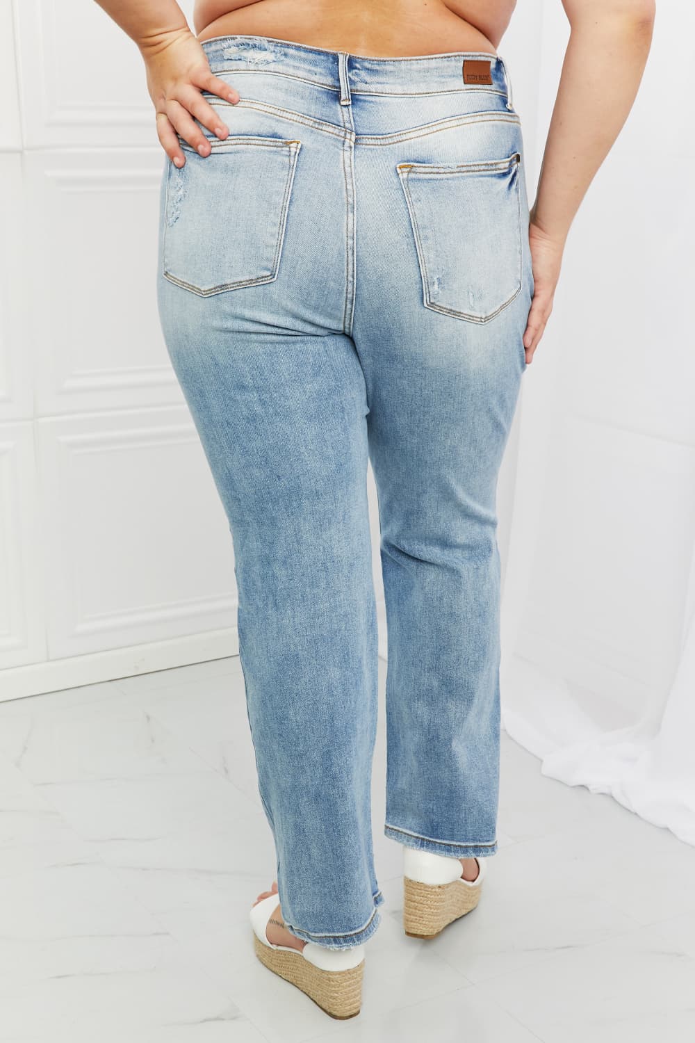 Judy Blue Natalie Full Size Distressed Straight Leg Jeans showcasing distressed detailing and high waist design.