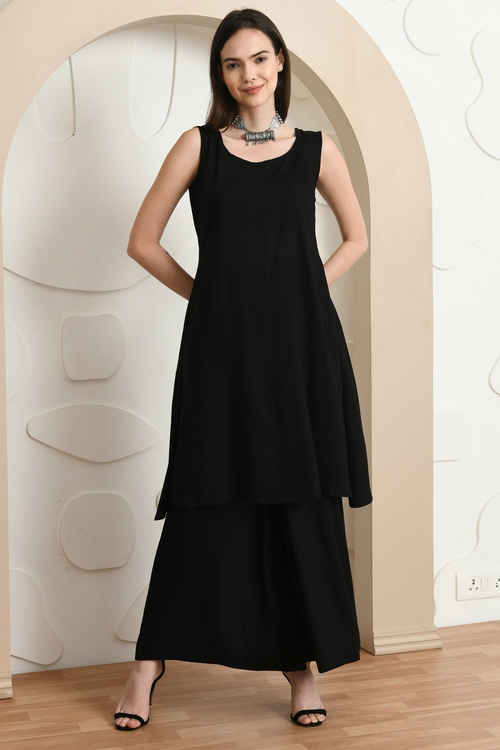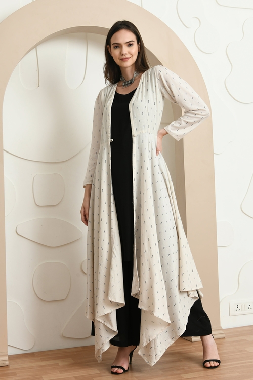 This outfit can be worn just the Palazzo bottom and Long kurta or it can be worn with a jacket . It is a very classy look for a semi festive collection..