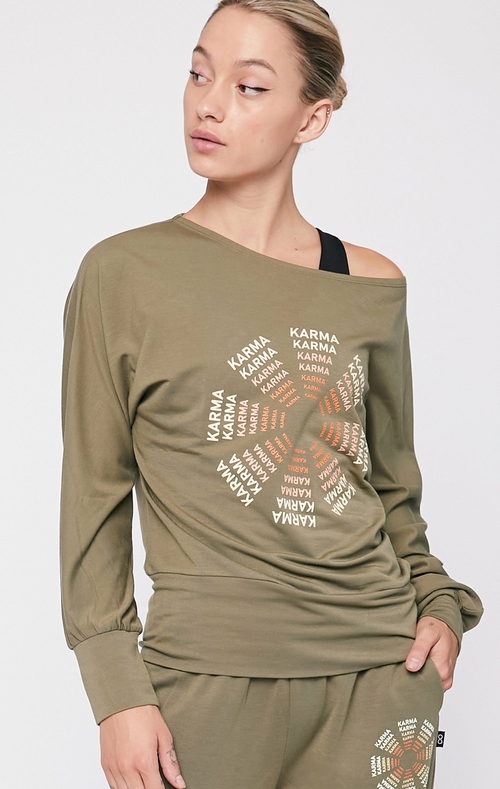 The Karma Graphic Viscose Blend Long Sleeve Top is the ultimate blend of style and comfort, designed for those who appreciate a chic yet relaxed look. This top features an off-shoulder style with a wider neck opening, allowing for a slouchy and fashionable appearance. Whether you're winding down after a workout or enjoying a cozy day at home, this top is perfect for all your indoor and outdoor activities.