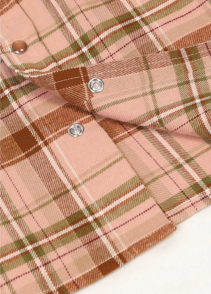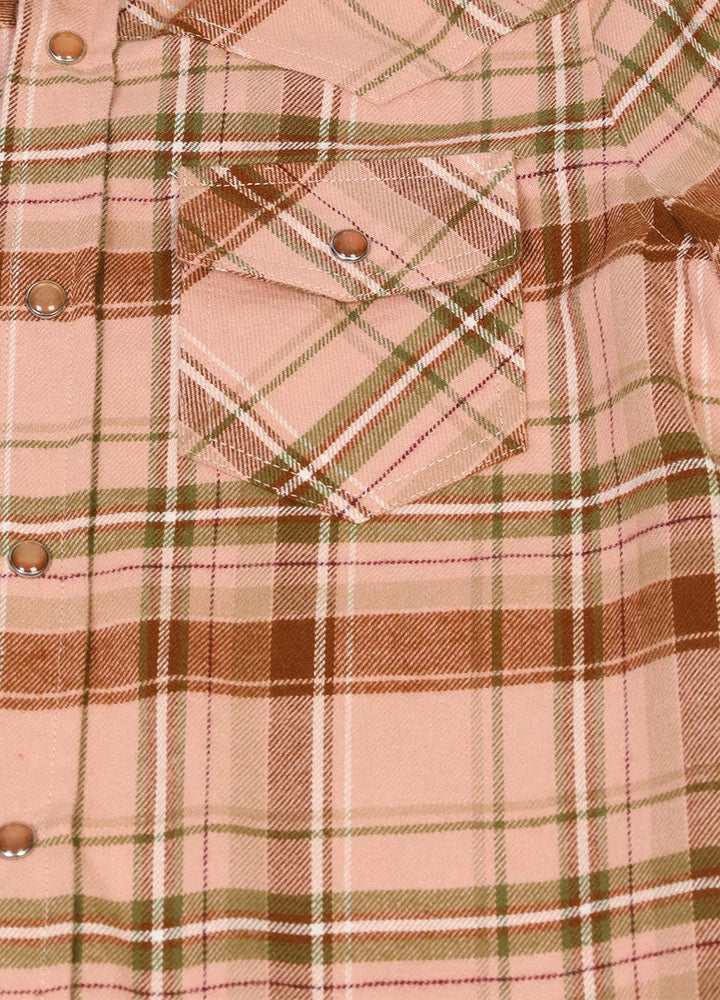 The shirt features a stylish collar lapel design that adds a touch of sophistication. The light brown pearl buttons not only enhance the overall look but also provide a classic Western charm that kids love. With two front chest pockets equipped with snap buttons, this shirt is not just stylish but also practical, allowing your child to store small treasures or keep their hands warm.