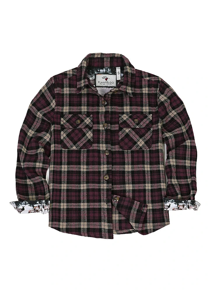 Kids Wildlife Adventure Flannel Plaid Shirt featuring cozy cotton fabric and hidden wildlife patterns.