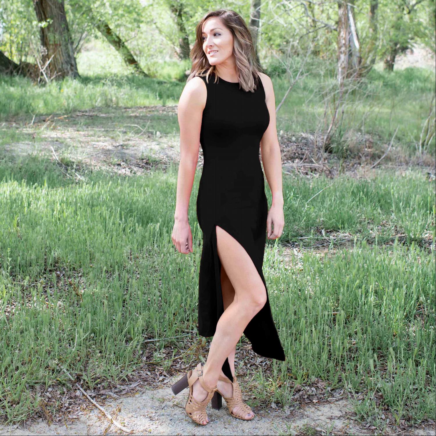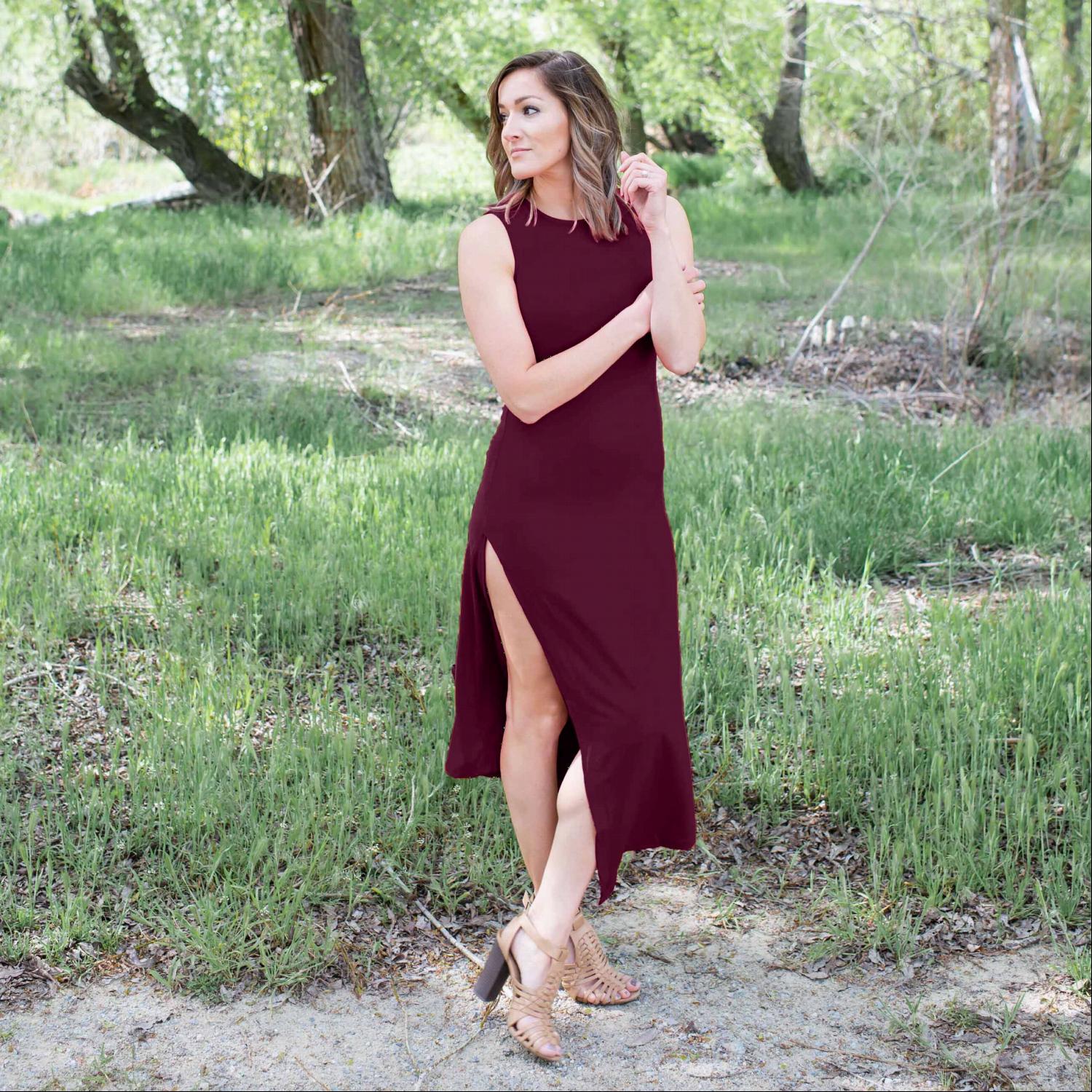 This maxi dress features a sleeveless design that highlights your shoulders, giving you a strong and sexy silhouette. The modest scoop neck adds a touch of sophistication, making it suitable for various body types. The front slit design not only adds a playful element but also elongates your legs, enhancing your overall appearance.