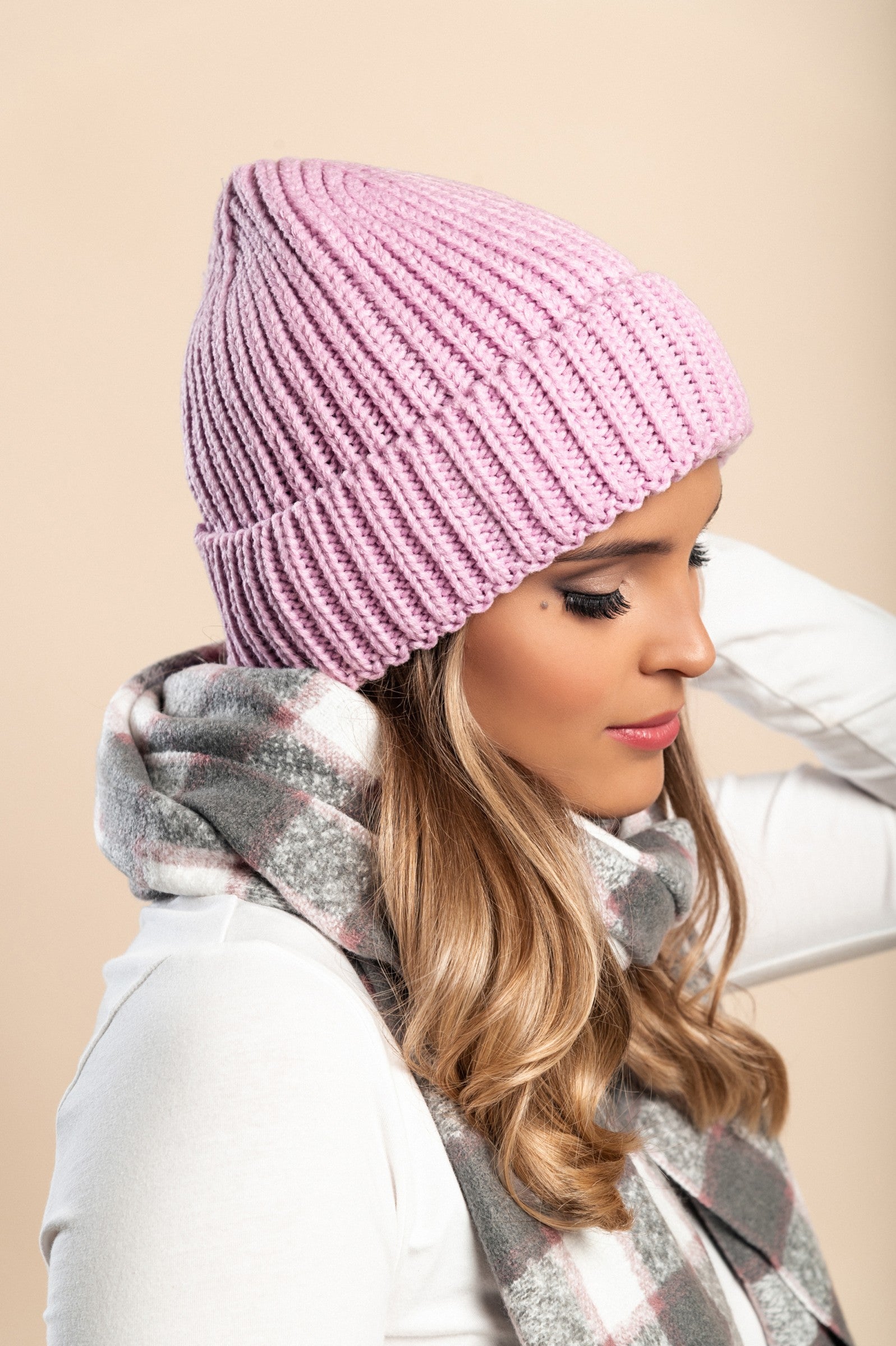 Light pink knitted hat made of soft fabric with a ribbed knit design and rolled hem, perfect for winter wear.