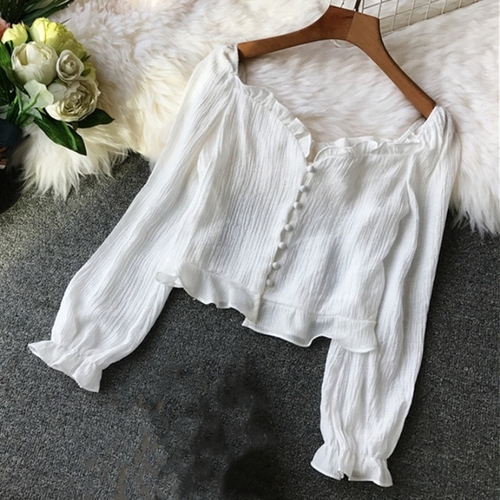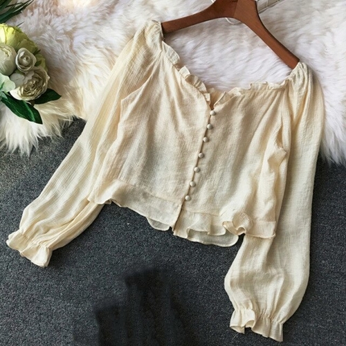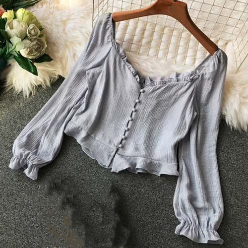 Gender: Women Material: COTTON Material: Polyester Clothing Length: Short Style: Casual Fabric Type: Chiffon Sleeve Length(cm): Full Decoration: Ruffles Pattern Type: Solid Collar: V-Neck Sleeve Style: Puff Sleeve Model Number: 5XF055