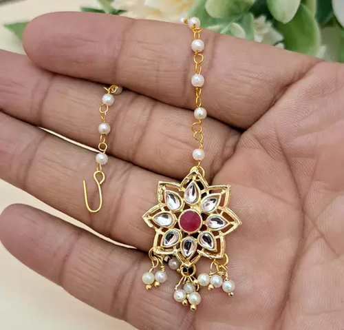 This beautifully crafted accessory is a true celebration of elegance and tradition. Made with the finest Kundan stones and delicate pearls, it exudes timeless charm and grace. Adorn your forehead with this maangtikka and experience the enchantment it brings to your look. The Kundan stones, known for their lustrous appeal, are intricately arranged in a captivating design, while the pearls add a touch of sophistication. The combination of these elements creates a stunning piece that effortlessly enhances your beauty.