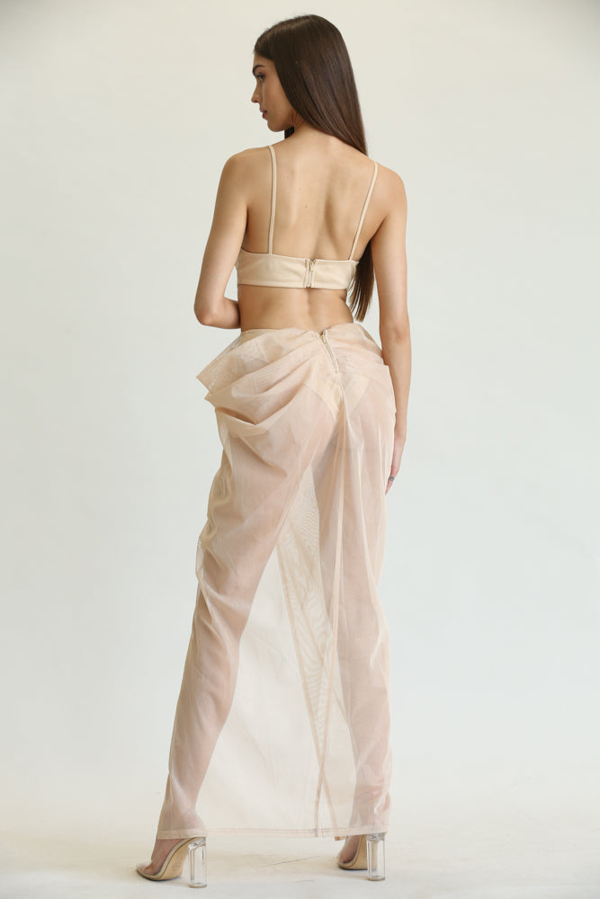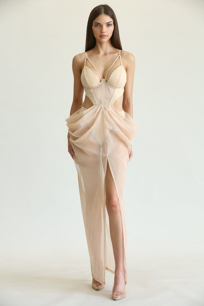The waist cutout further emphasizes the dress's unique design, creating a flattering shape that highlights your waistline. The attached organza mesh skirt features pleat and drape details, adding volume and movement to the dress. This combination of textures and styles ensures that you will stand out in any crowd.