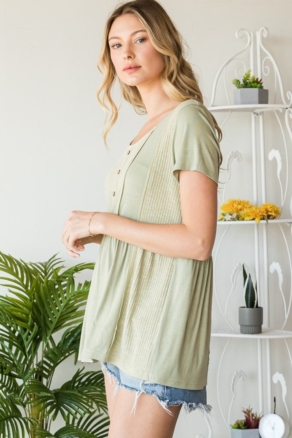 Crafted with a soft color palette, this henley top pairs beautifully with a variety of neutrals and colors, allowing for endless styling options. Whether you're dressing it up with a statement necklace or keeping it simple with your favorite jeans, this top is sure to become a staple in your closet. The round neckline and short sleeves provide a relaxed fit, making it ideal for warm weather or layering during cooler months.