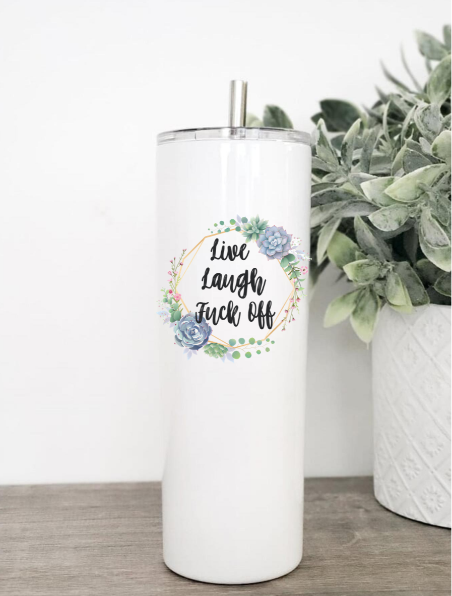In a world full of ordinary drinkware, the Live Laugh Fuck Off tumbler stands out with its cheeky message and beautiful floral design. It's not just a tumbler; it's a statement piece that reflects your personality. Whether you're at home, at work, or on the go, this tumbler is sure to turn heads and spark conversations.