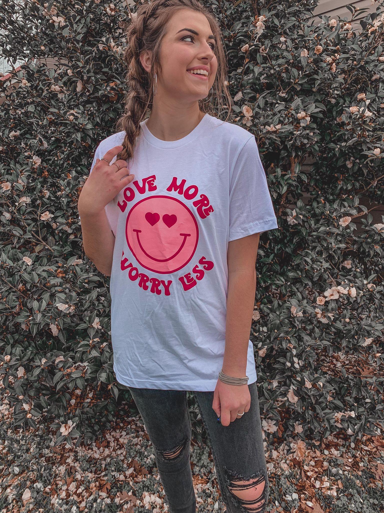 The Love More Worry Less Tee is not just a piece of clothing; it's a statement of positivity and comfort. With its vibrant colors printed on a classic white background, this tee serves as a daily reminder to embrace love and let go of worries. Crafted from high-quality materials, this shirt is designed to be both stylish and comfortable, making it a perfect addition to any wardrobe.