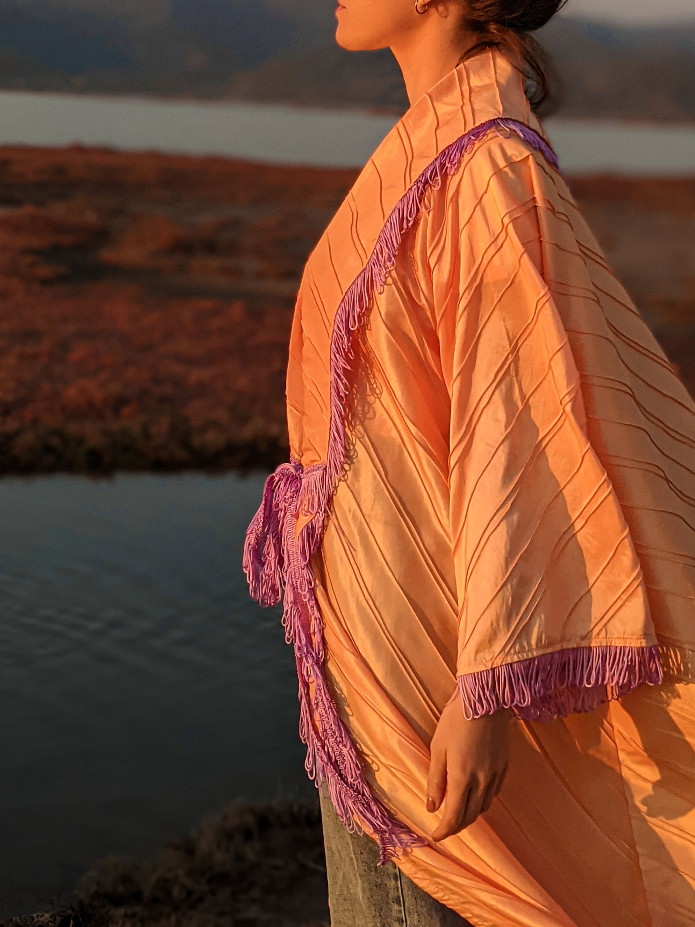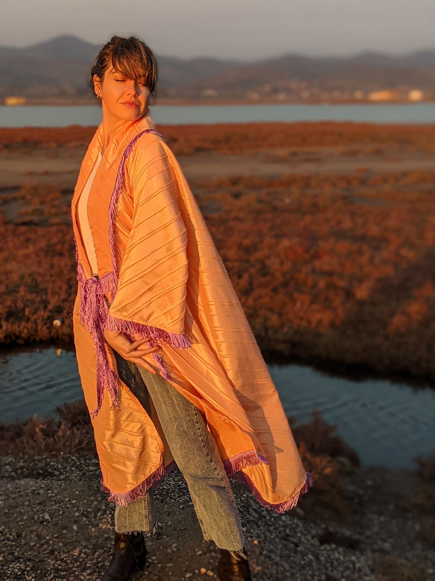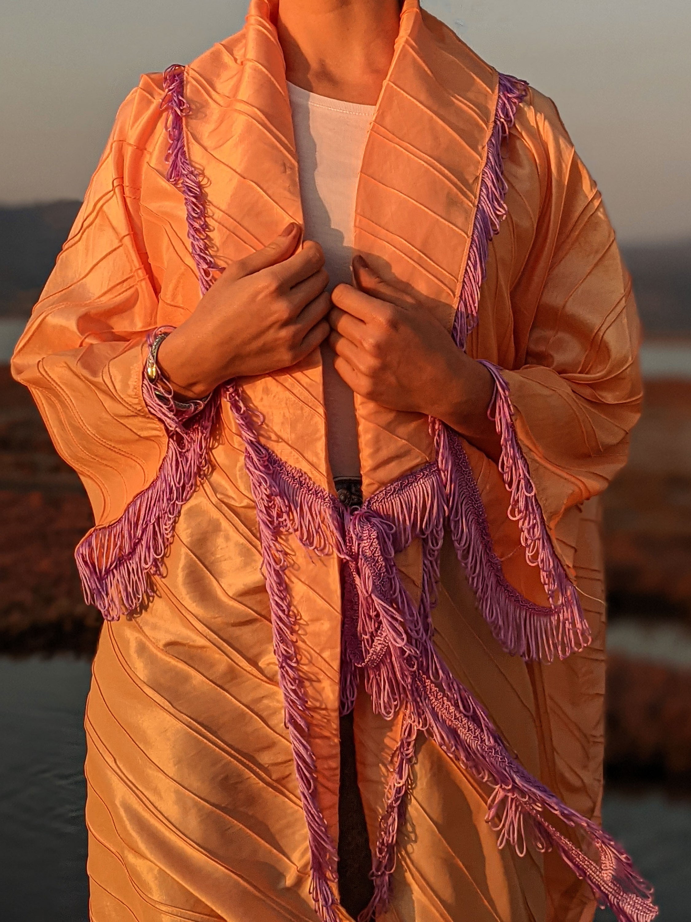 The LYDAI outerwear is a stunning piece crafted from high-quality salmon color taffeta fabric, designed to elevate your wardrobe. This stylish outerwear is not just a fashion statement; it combines elegance and comfort, making it a must-have for any fashion-forward individual. The unique salmon hue adds a touch of warmth and sophistication, while the lilac fringes that adorn the garment provide a playful yet chic contrast.