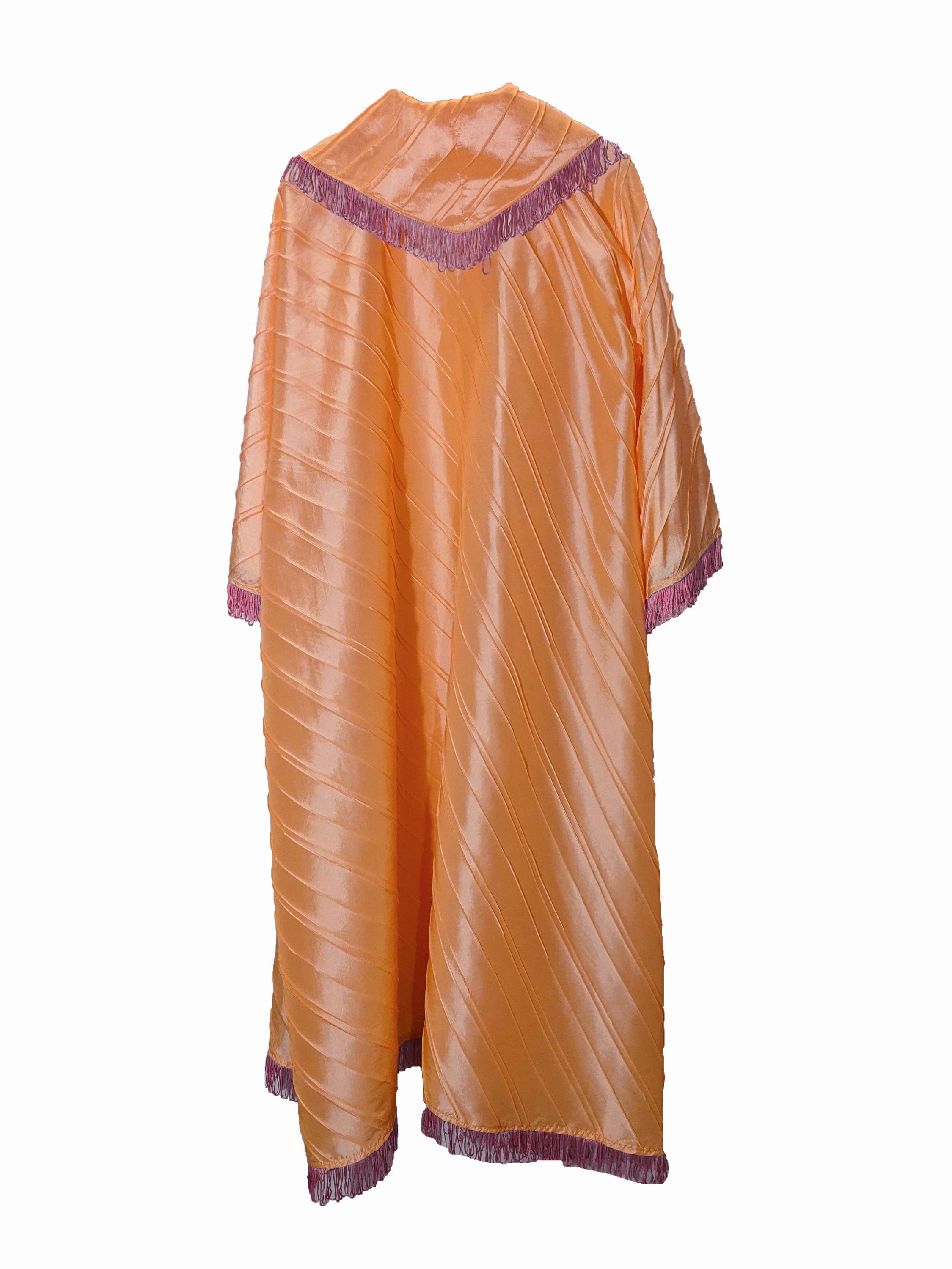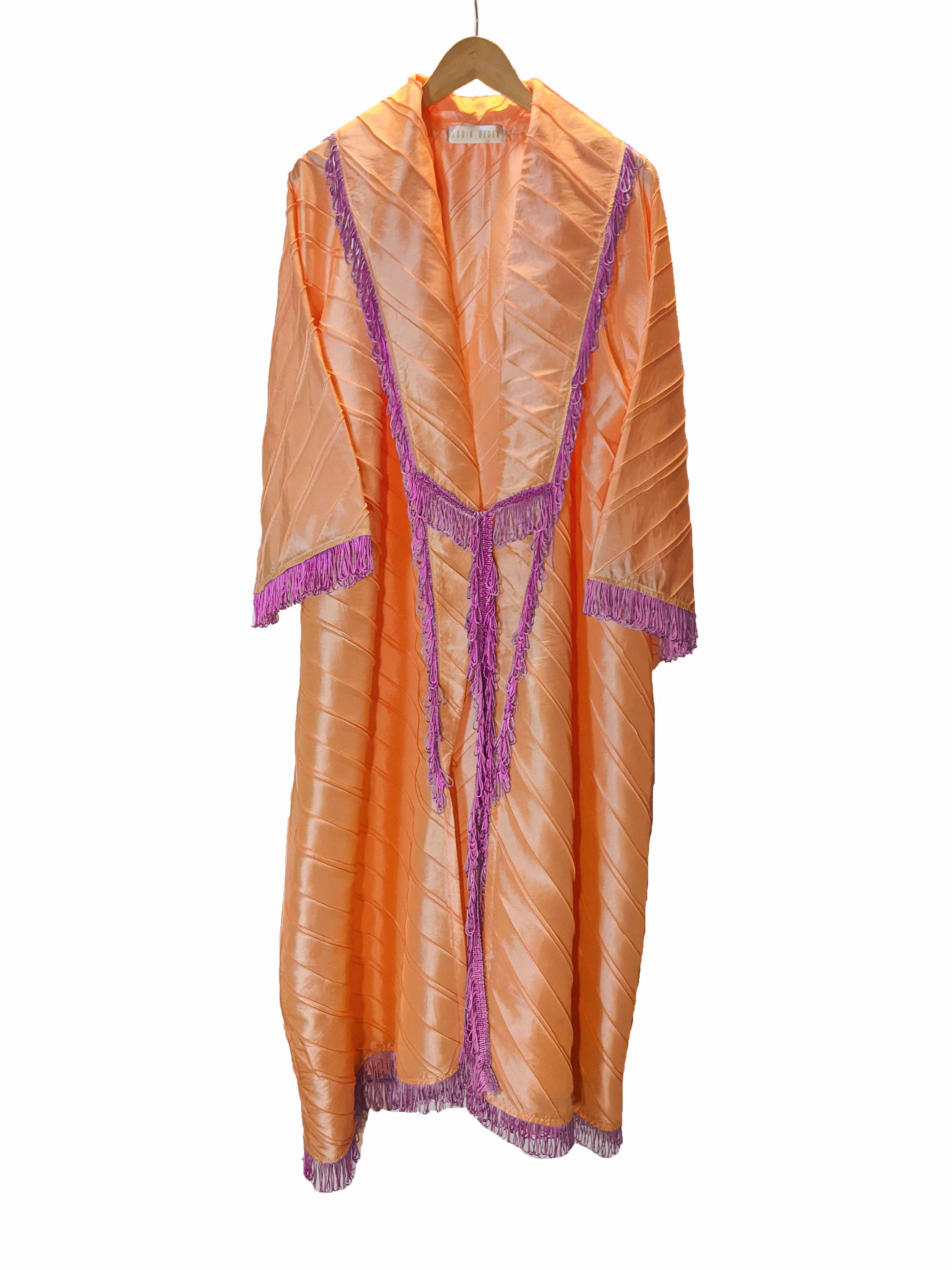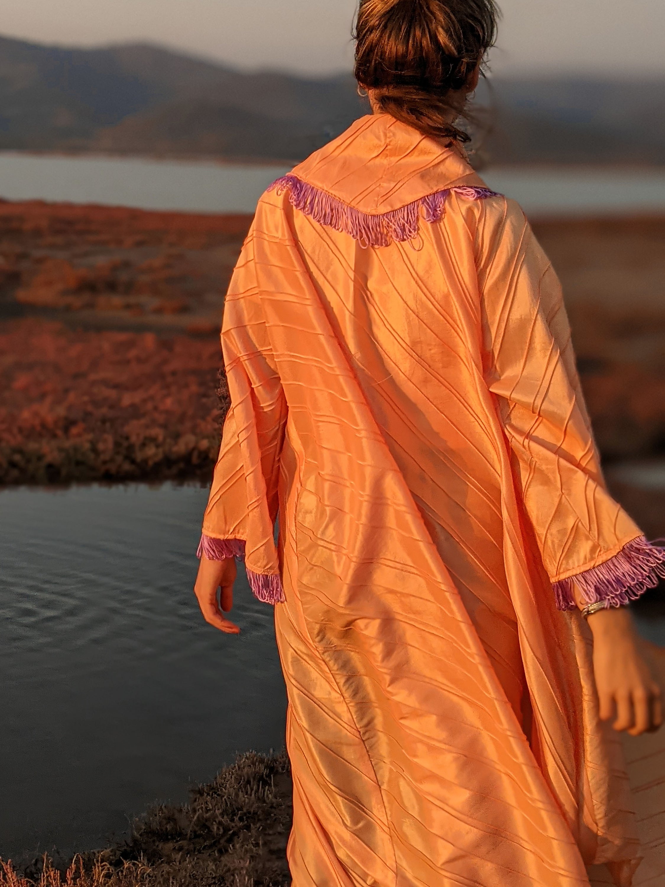 The LYDAI outerwear is a stunning piece crafted from high-quality salmon color taffeta fabric, designed to elevate your wardrobe. This stylish outerwear is not just a fashion statement; it combines elegance and comfort, making it a must-have for any fashion-forward individual. The unique salmon hue adds a touch of warmth and sophistication, while the lilac fringes that adorn the garment provide a playful yet chic contrast.