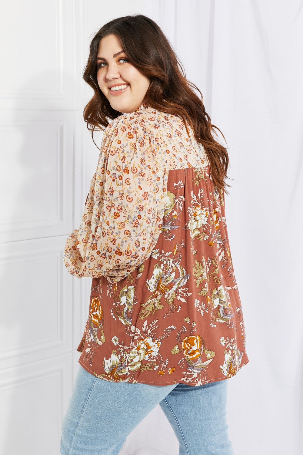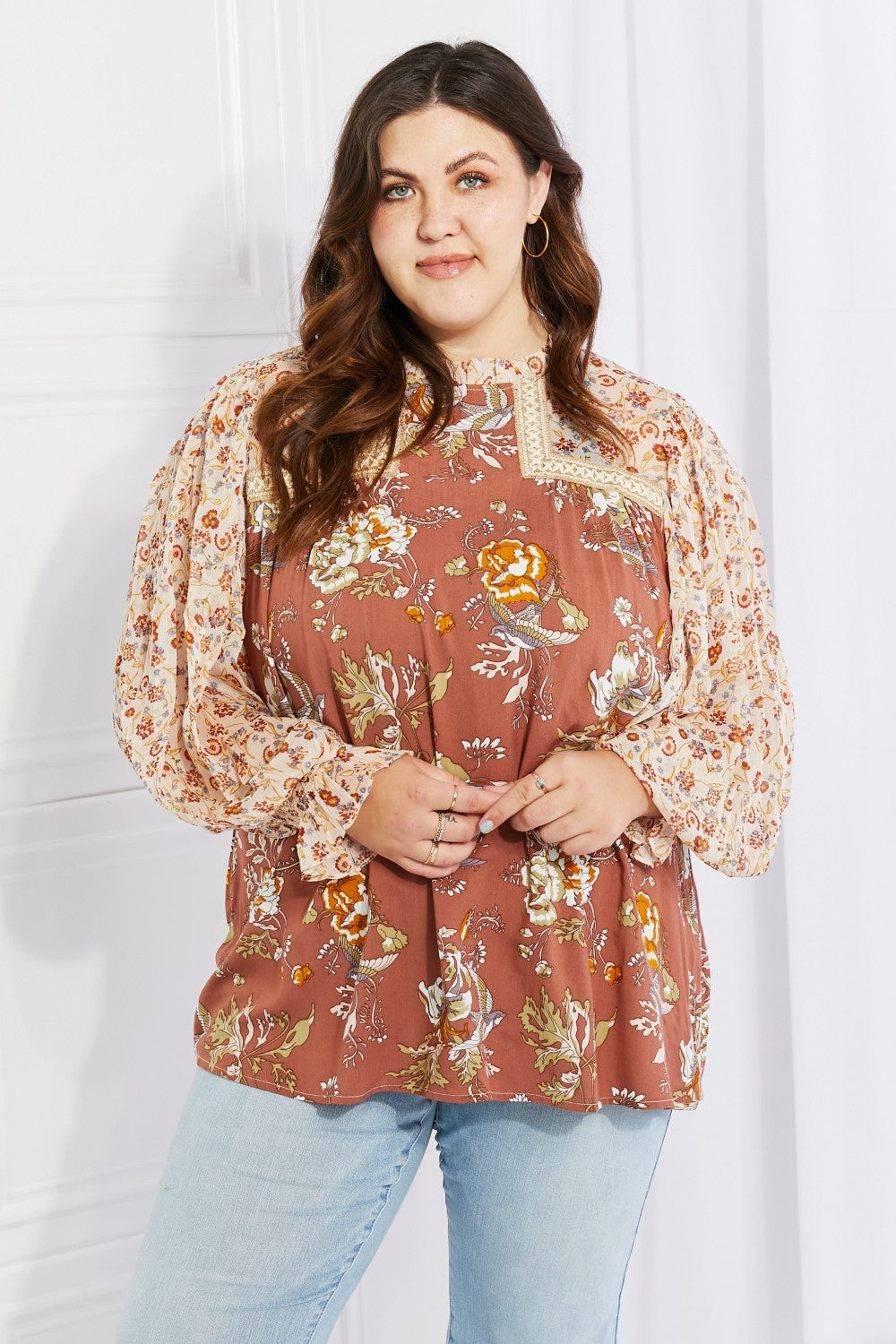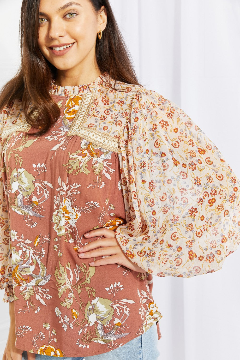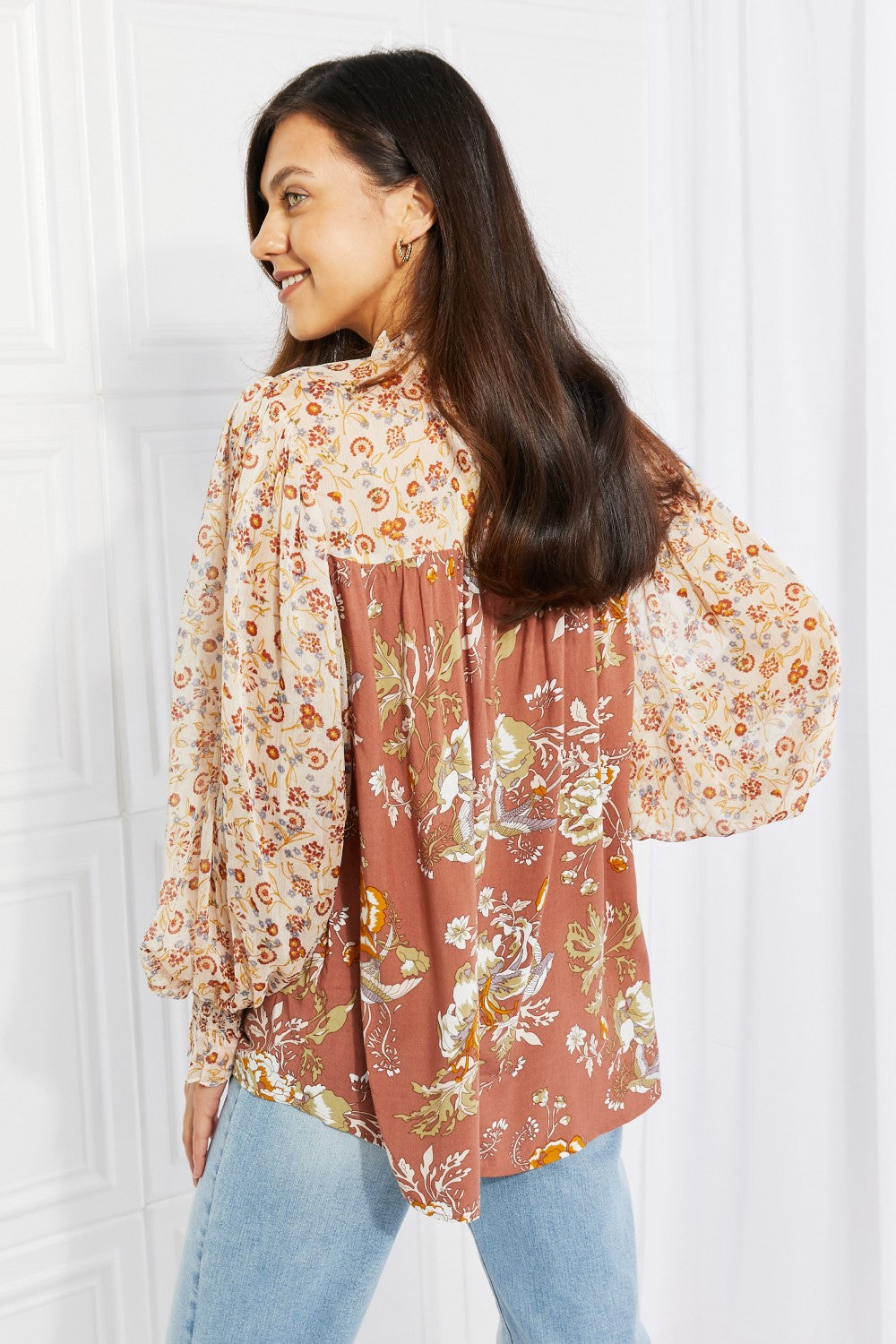 The Make It Mine Floral Chiffon Top is a stunning addition to any wardrobe, designed to make you stand out with its eye-catching floral prints. This woven top features billowing balloon sleeves crafted from luxurious chiffon fabric, ensuring that they maintain their dramatic structure while providing comfort and elegance. The ruffled mock neck adds a touch of sophistication, making this top perfect for both casual outings and more formal occasions.