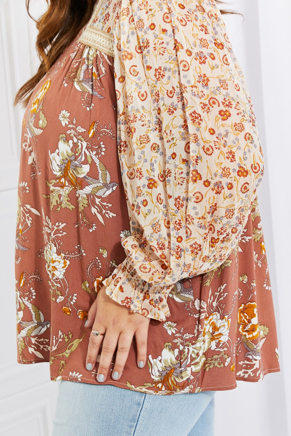 With its unique trim detail and contrasting floral patterns, the Make It Mine Floral Chiffon Top is not just a piece of clothing; it's a statement. The round neckline and long balloon sleeves create a flattering silhouette that complements various body types. Whether you're dressing up for a brunch date or keeping it casual for a day out, this top is versatile enough to suit any occasion.