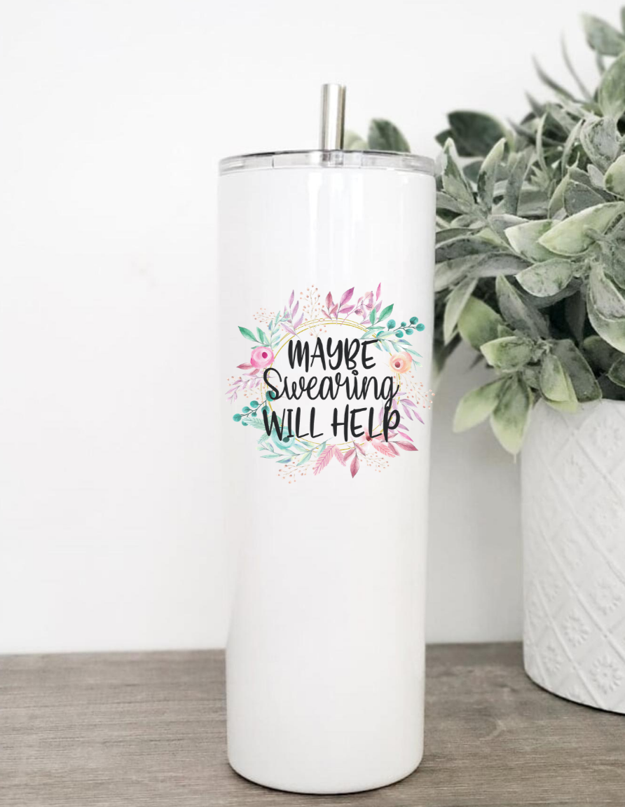 Maybe Swearing Will Help floral tumbler with clear lid and stainless steel straw, available in 20 or 30 oz sizes.