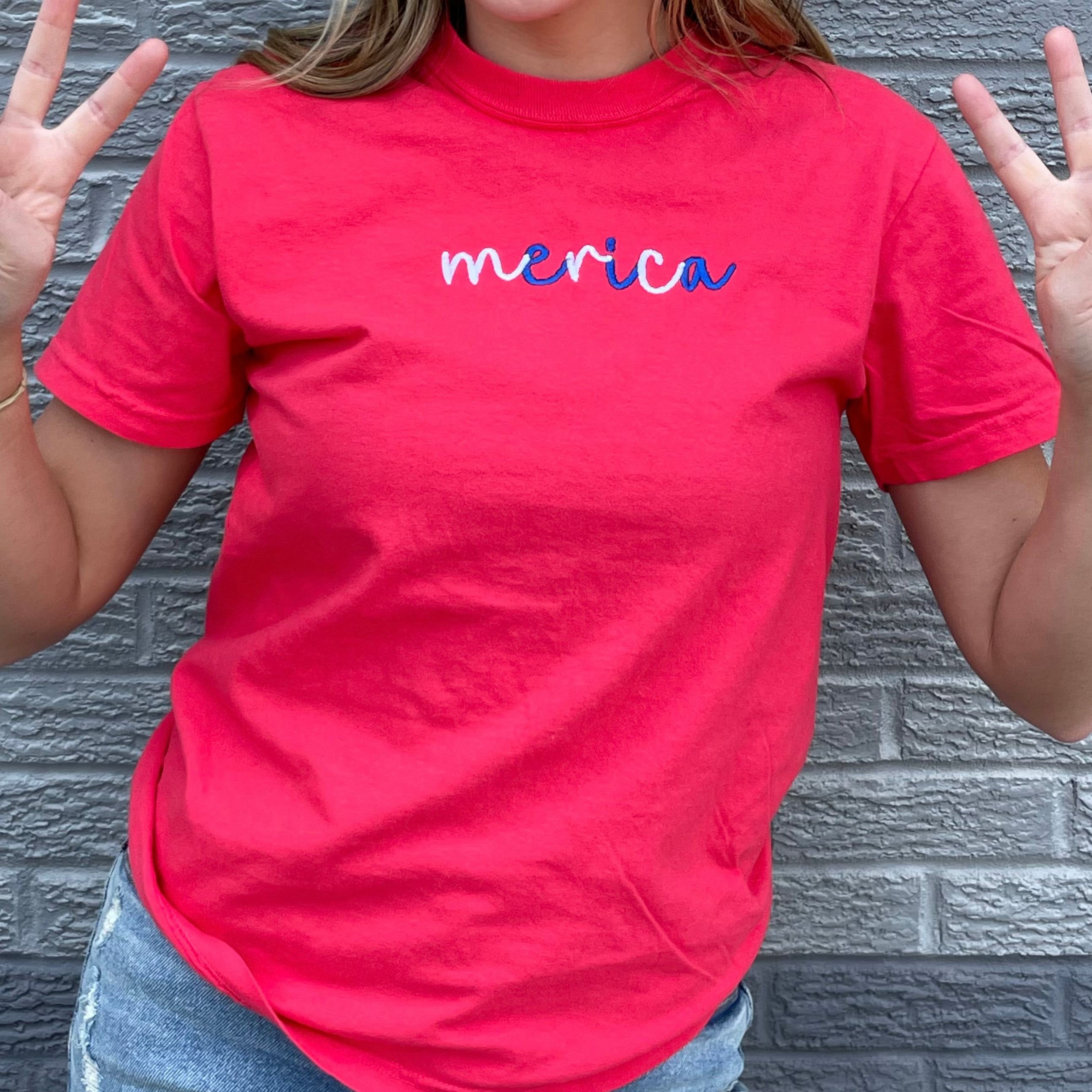 The Merica Embroidered Tee can be styled in numerous ways. Pair it with your favorite jeans for a casual look, or dress it up with a skirt and accessories for a fun night out. It’s also perfect for layering under jackets or cardigans during cooler months. The possibilities are endless, making it a staple piece in your wardrobe.