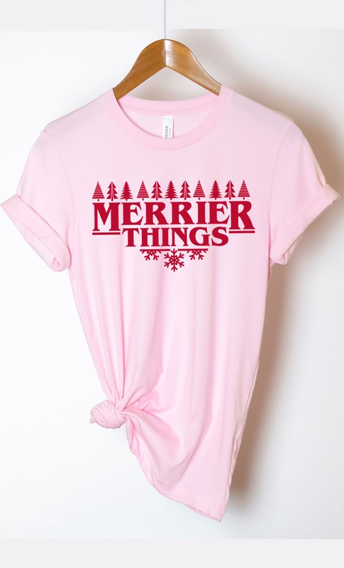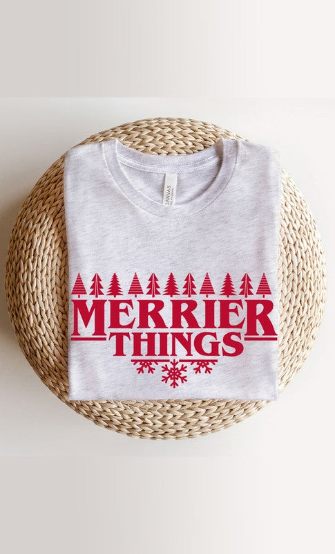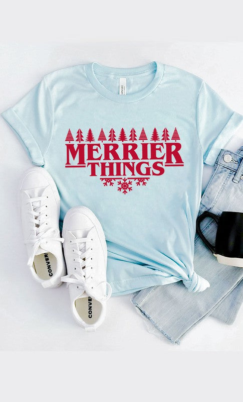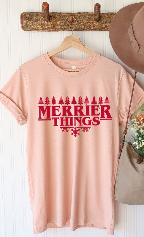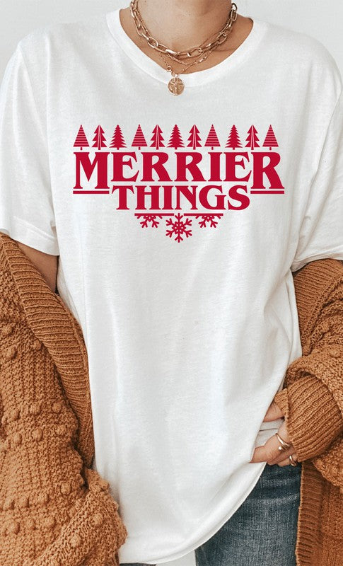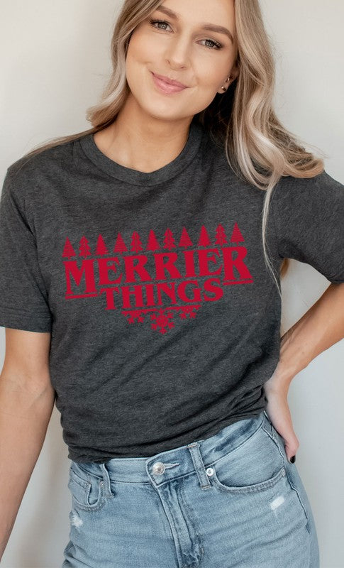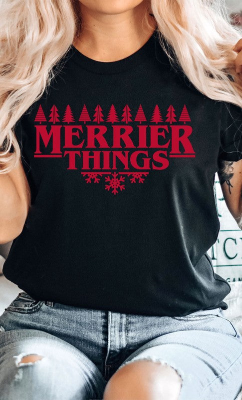 This graphic tee is not only festive but also versatile. It can be paired with jeans, leggings, or even a skirt for a more dressed-up look. Whether you're attending a holiday brunch or a cozy evening with friends, the Merrier Things tee can be styled to suit any occasion. The playful graphic design adds a touch of whimsy, making it a conversation starter wherever you go.
