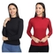 The high neck design of this woman's top provides a stylish and sophisticated look.
