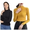 The high neck design of this woman's top provides a stylish and sophisticated look.
