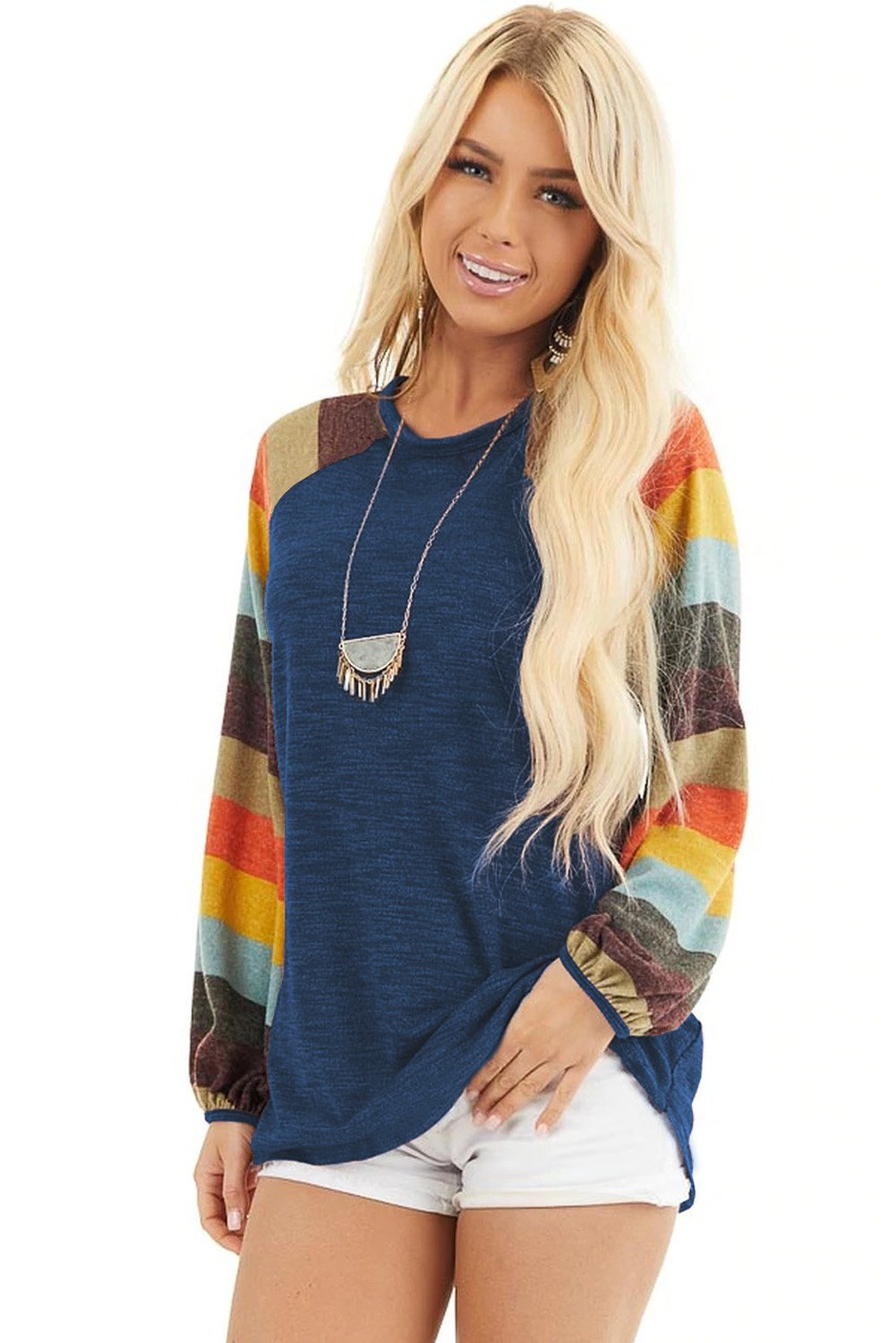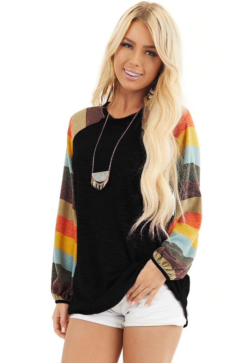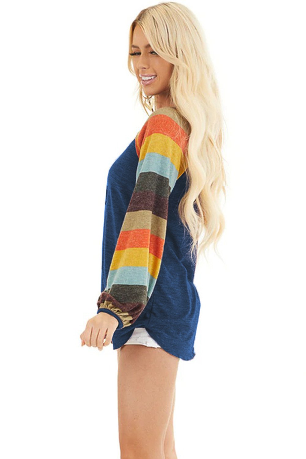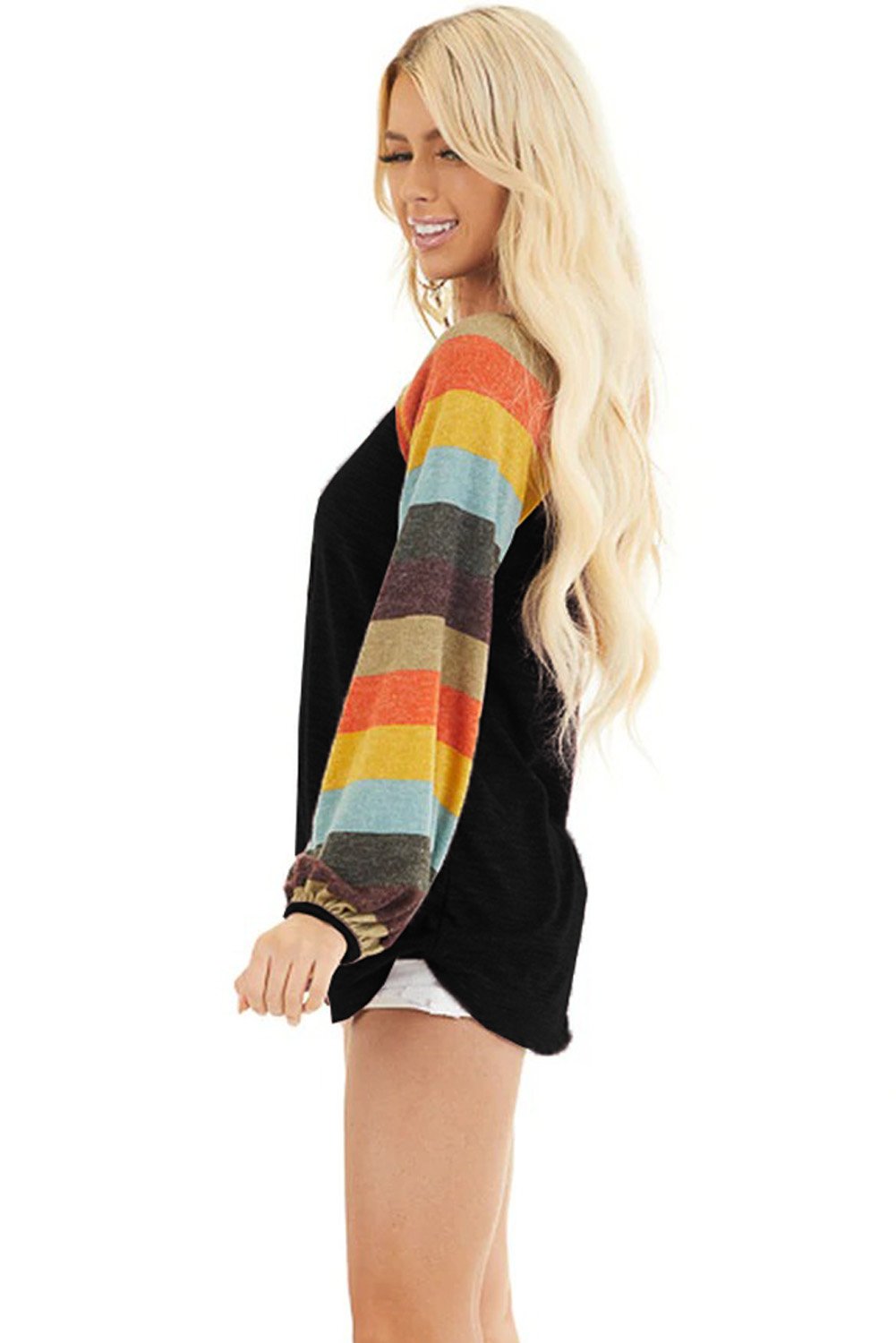 The eye-catching multicolor stripes are designed to make you stand out in a crowd. Whether you're heading to brunch with friends or a night out on the town, this top will ensure you look chic and fashionable. The balloon sleeves are a trendy element that adds a touch of sophistication to your look, making it a favorite among modern ladies.