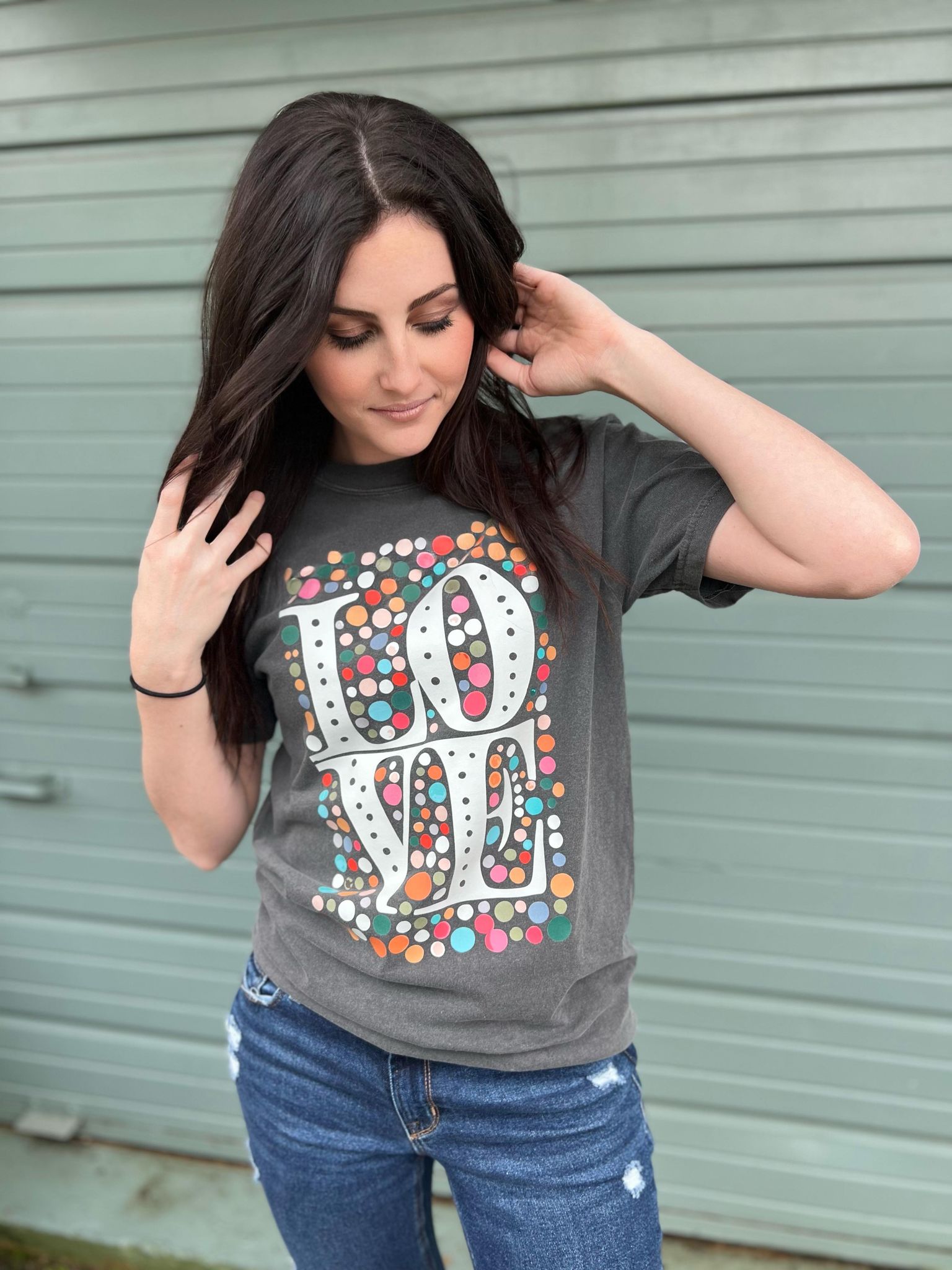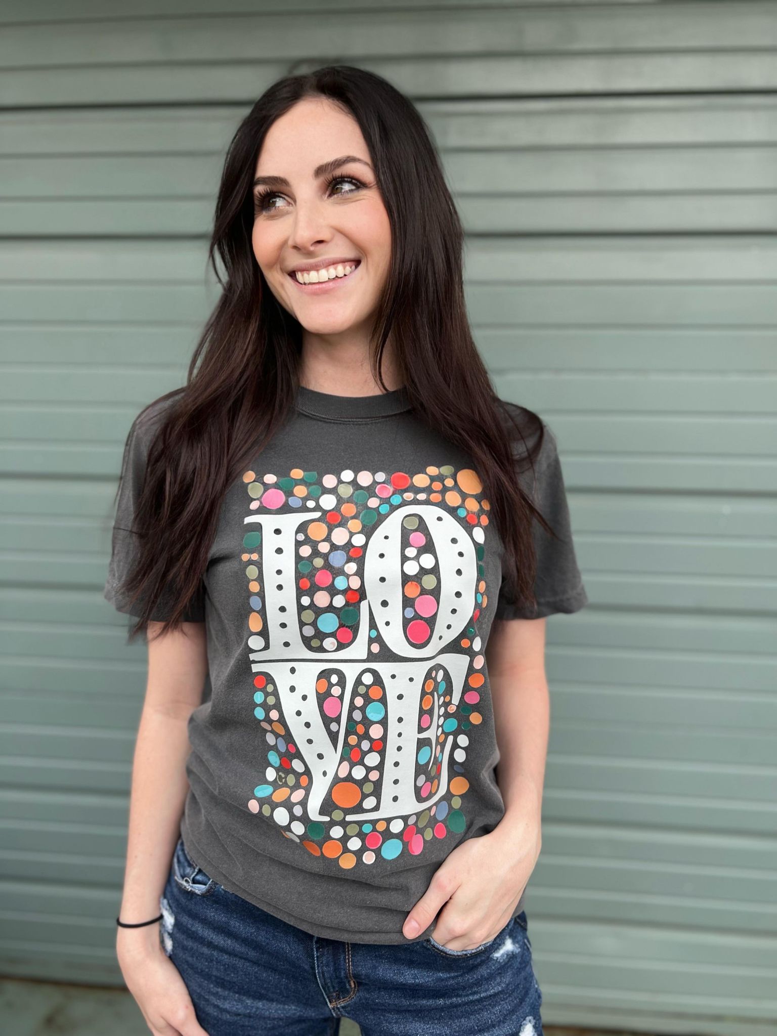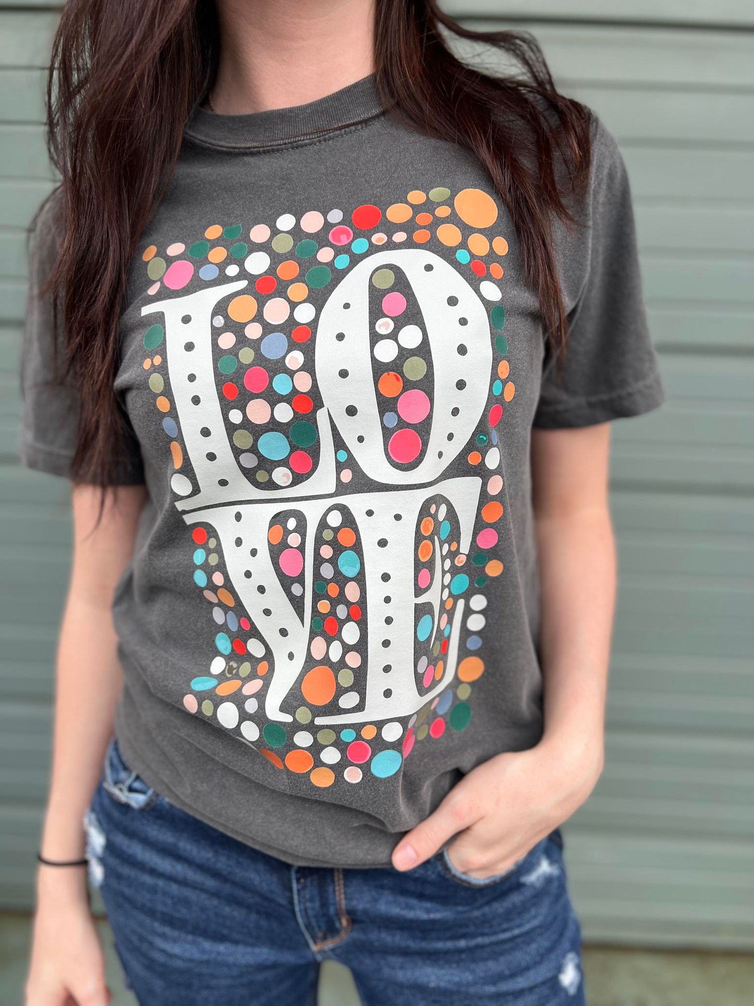 The graphic on the Multi Colored Love Tee is professionally DTF printed, ensuring vibrant colors and sharp details that won't fade over time. This printing method provides a high-quality finish that enhances the overall look of the tee, making it a standout piece in your collection.