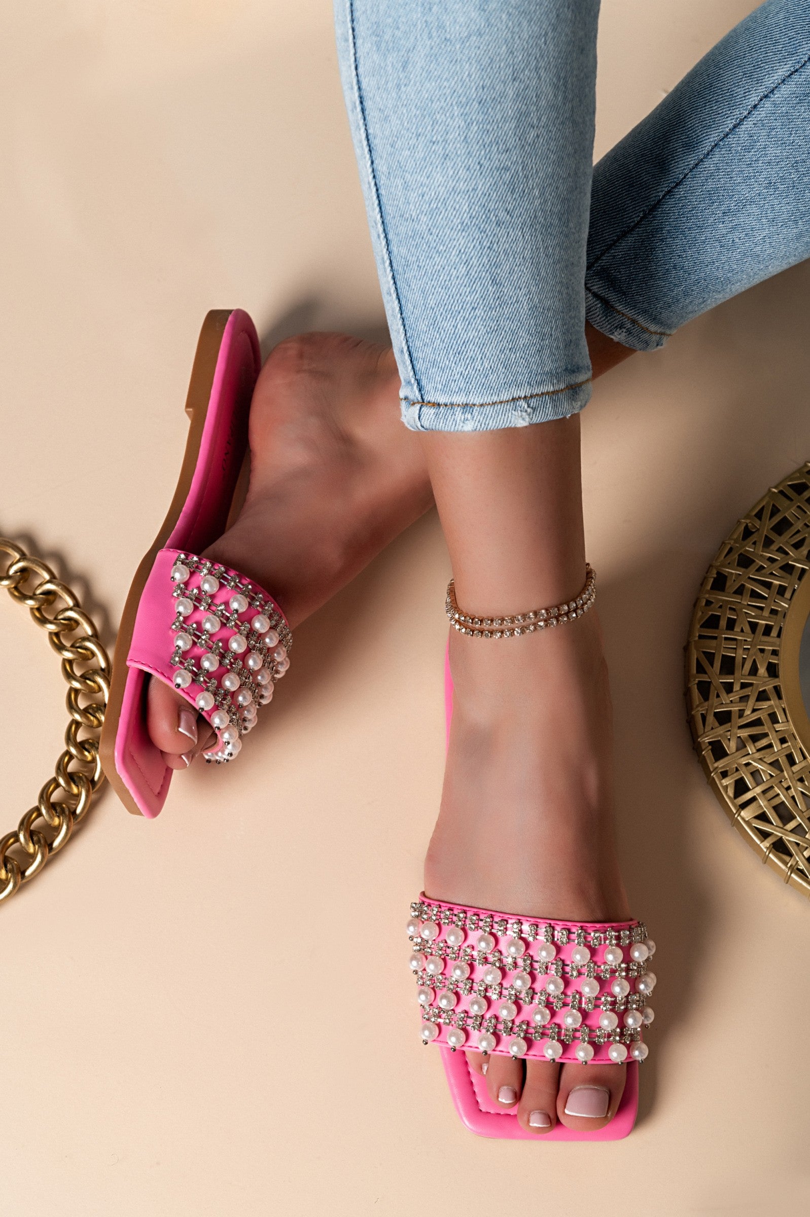 Odkrijte čarobnost natikačev z okrasnimi perlicami v svetlo roza barvi, ki so popolna izbira za vsakodnevno nošenje. Ti natikači so zasnovani z mislijo na udobje in stil, kar jih naredi idealne za poletne dni, sprehode po plaži ali sproščene trenutke doma. Njihov ravni podplat zagotavlja udobno hojo, medtem ko širok pašček in okrasne perlice dodajajo pridih elegance.