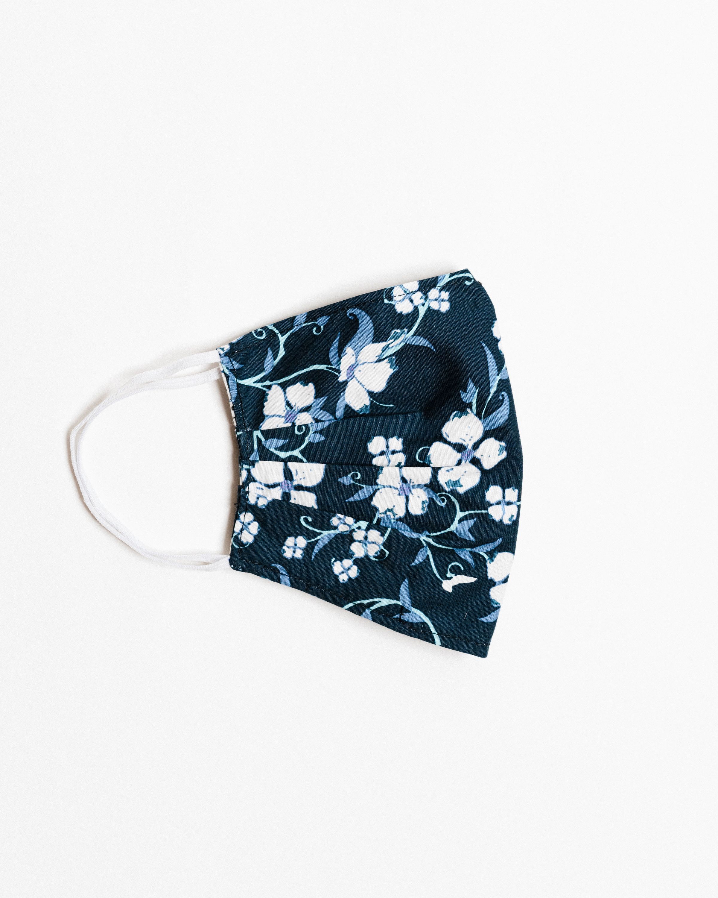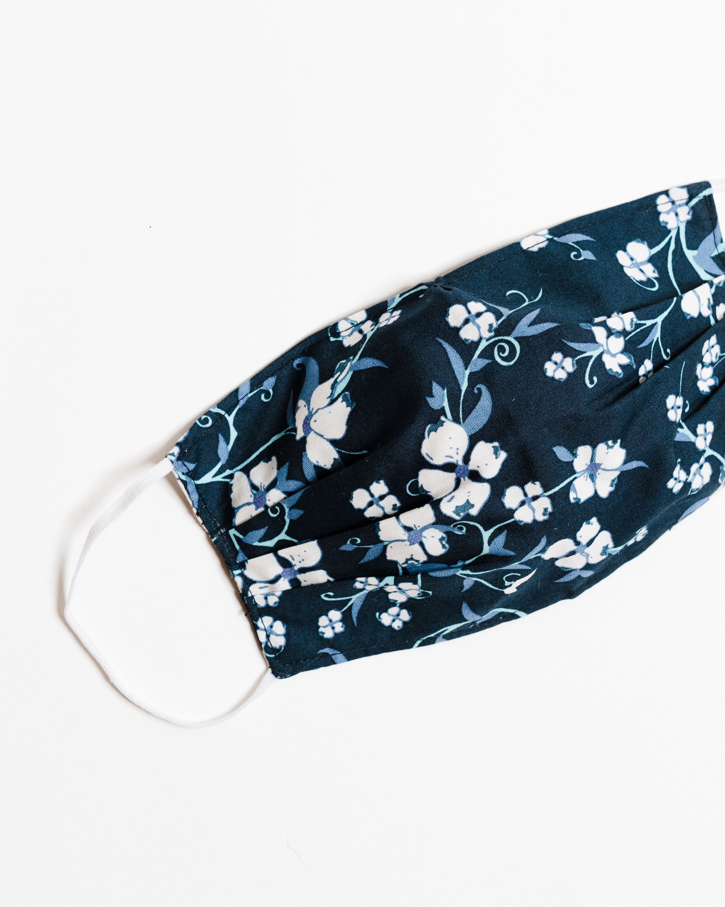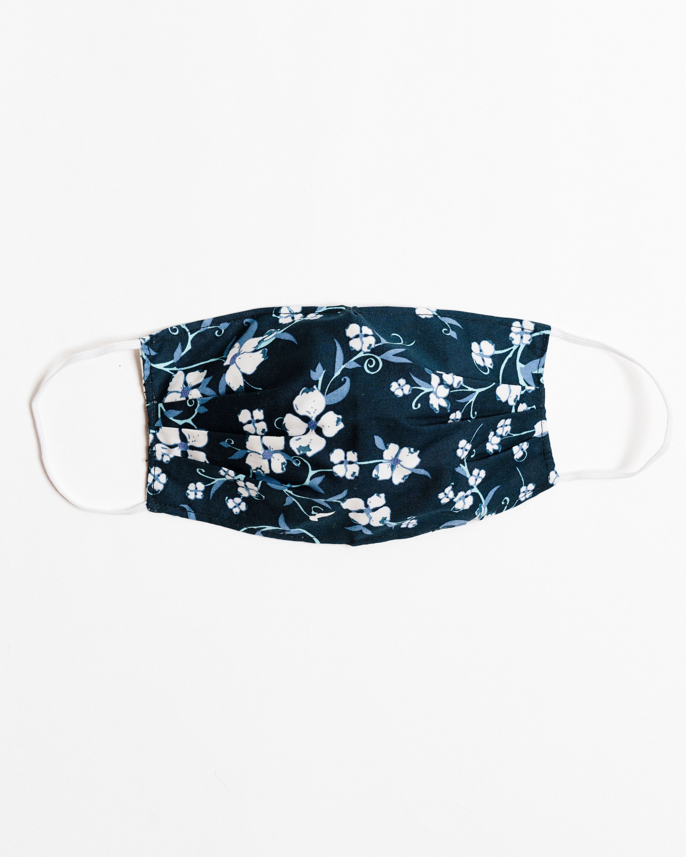 Our Navy Floral Face Mask is designed with your comfort in mind. It includes four pleats on each side, allowing for an ultimate fit that adapts to various face shapes. Additionally, a nose pleat provides extra room, ensuring that the mask sits comfortably without pinching or sliding down. The elastic straps are made from a blended material that may include latex, providing a secure fit around the ears without causing discomfort.