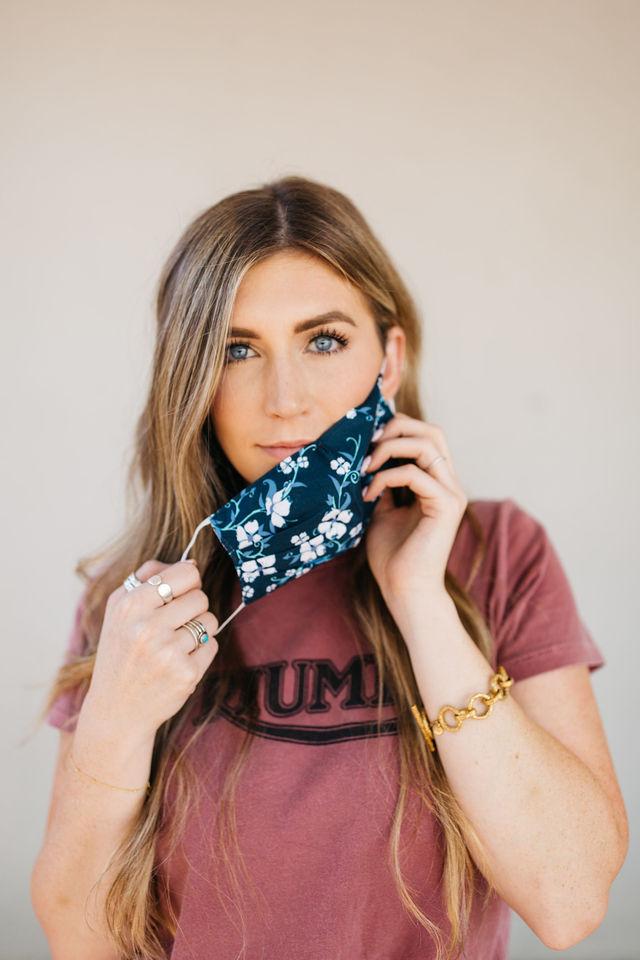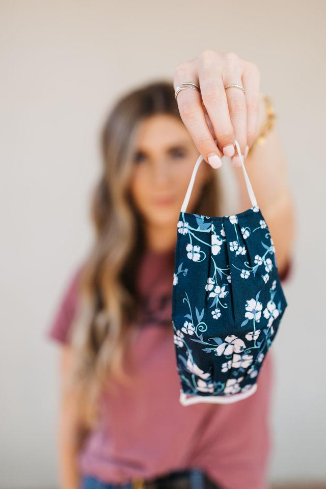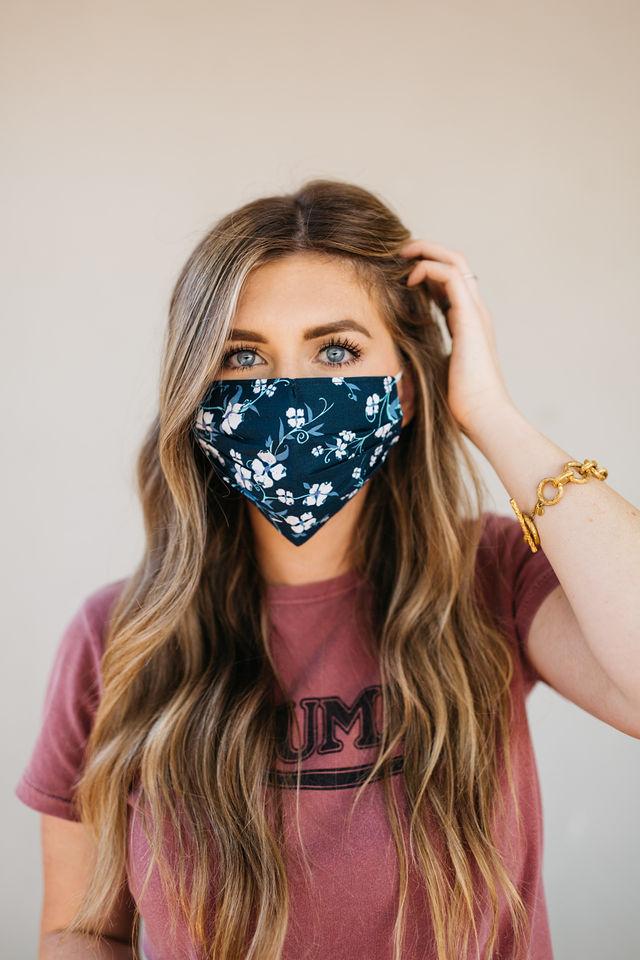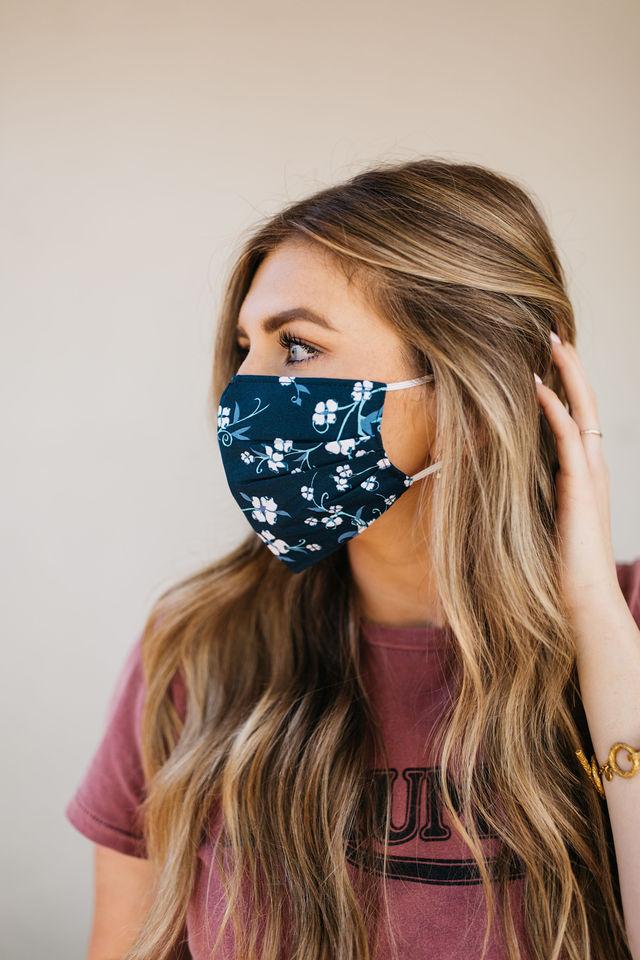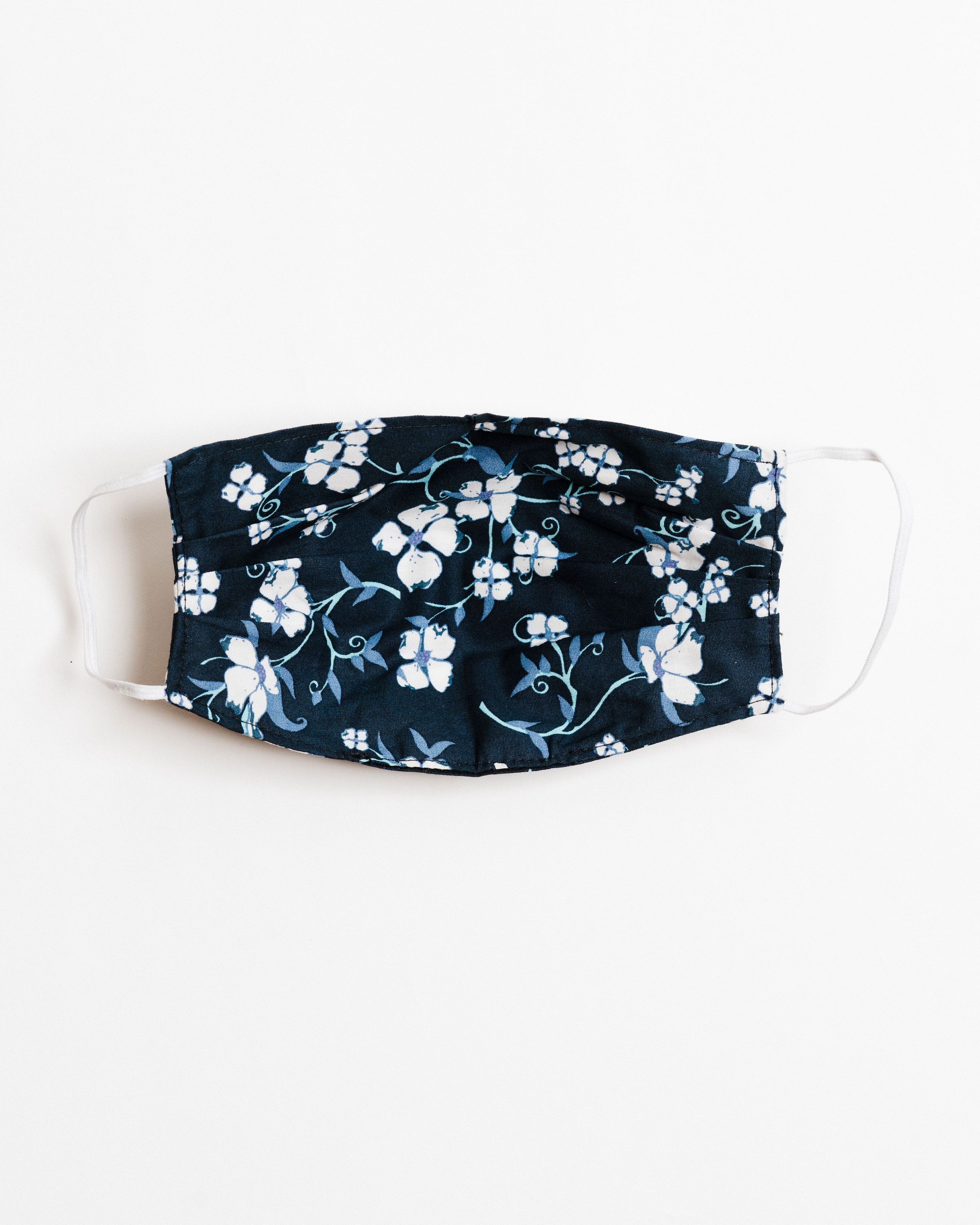 Our Navy Floral Face Mask is designed with your comfort in mind. It includes four pleats on each side, allowing for an ultimate fit that adapts to various face shapes. Additionally, a nose pleat provides extra room, ensuring that the mask sits comfortably without pinching or sliding down. The elastic straps are made from a blended material that may include latex, providing a secure fit around the ears without causing discomfort.