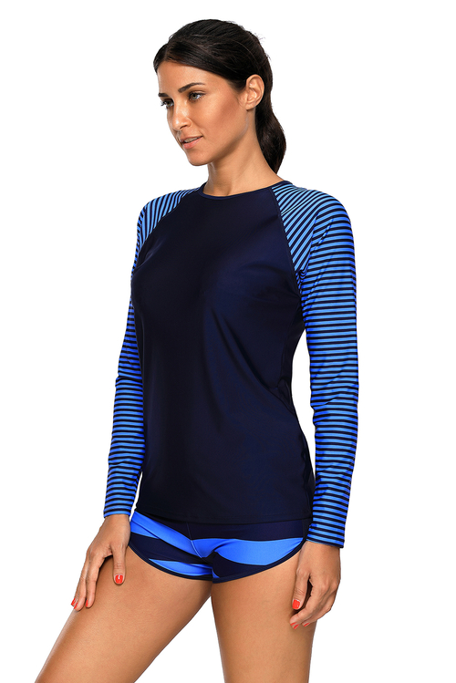 Long sleeves, tighter fit, quick dry, comfortable and durable to own this wholesale Navy Stripes Long Sleeve Rashguard Tankini Swimsuit. This sunsuit is designed to protect your skin when you enjoy sunshine on beach. Tightly knitted fabric offers protection against the sun UV radiation all day long. The swim top is wirefree and no sponge paddings insert.