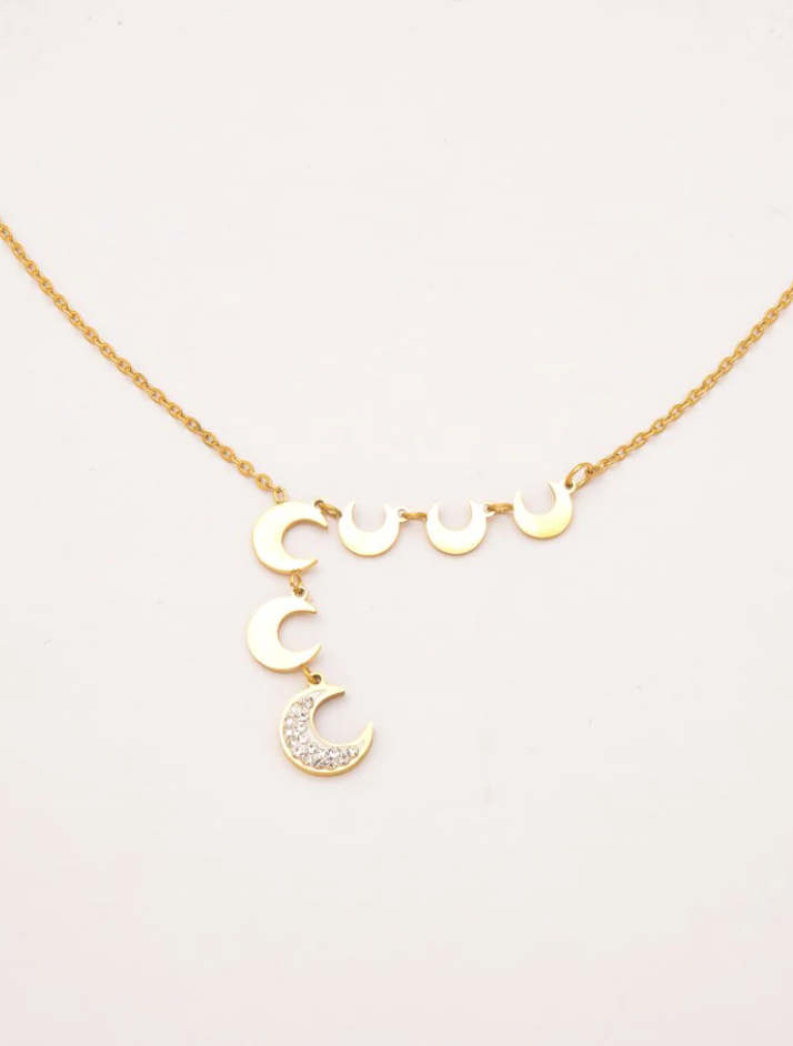 The necklace features beautifully crafted moon-shaped pendants that hang gracefully, catching the light with every movement. The intricate design of the pendants adds a celestial charm, making it an ideal choice for both casual and formal occasions. Whether you're dressing up for a night out or adding flair to your everyday look, this necklace is sure to make a statement.