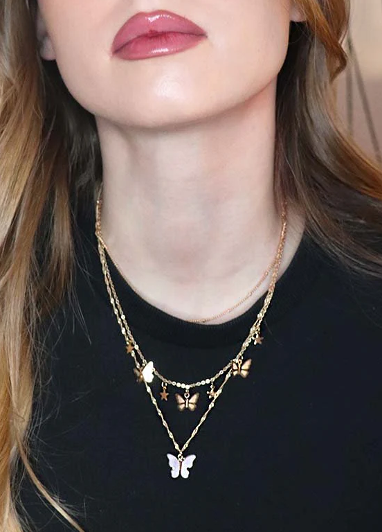 Discover the beauty of our elegant necklace featuring stunning butterfly-shaped pendants in a luxurious gold color. This exquisite piece is designed to brighten any outfit, making it a versatile addition to your jewelry collection. Whether you're dressing up for a special occasion or adding a touch of elegance to your everyday wear, this necklace is sure to turn heads.