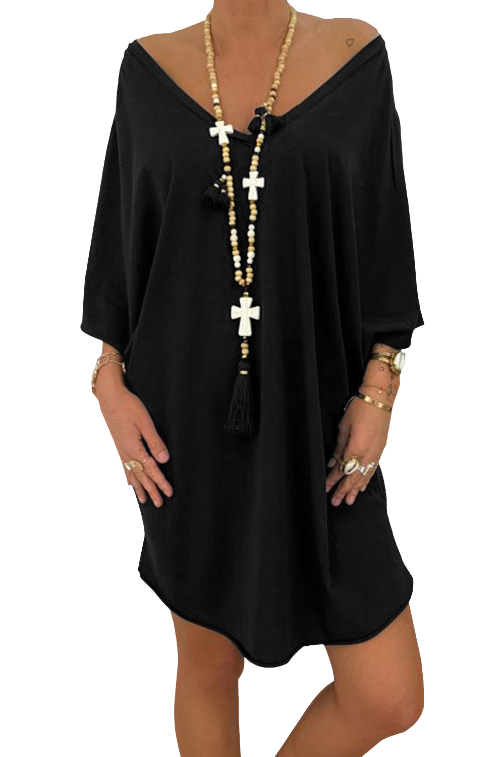 Obleka se ponaša z 'V' izrezom spredaj in zadaj, kar dodaja pridih elegance in ženstvenosti. Ta detajl ne le, da izboljša videz obleke, temveč tudi omogoča, da se vaša koža prijetno dotika zraka, kar je še posebej prijetno v toplejših mesecih. 3/4 široki rokavi so še en odličen dodatek, ki omogoča udobno nošenje in hkrati daje obleki moderen videz.