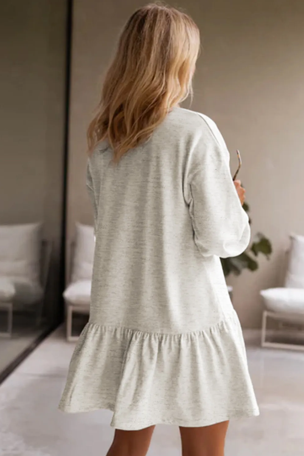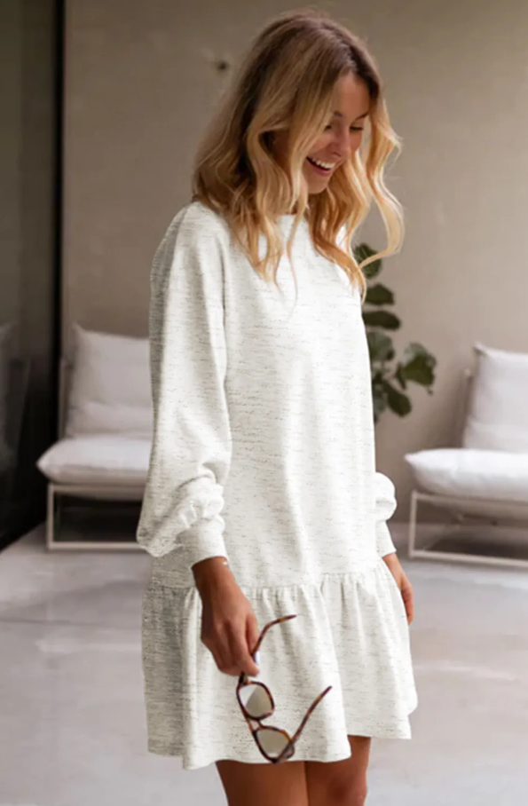 Elegantna bela ohlapna obleka z napihnjenimi rokavi in volanastim krilom.