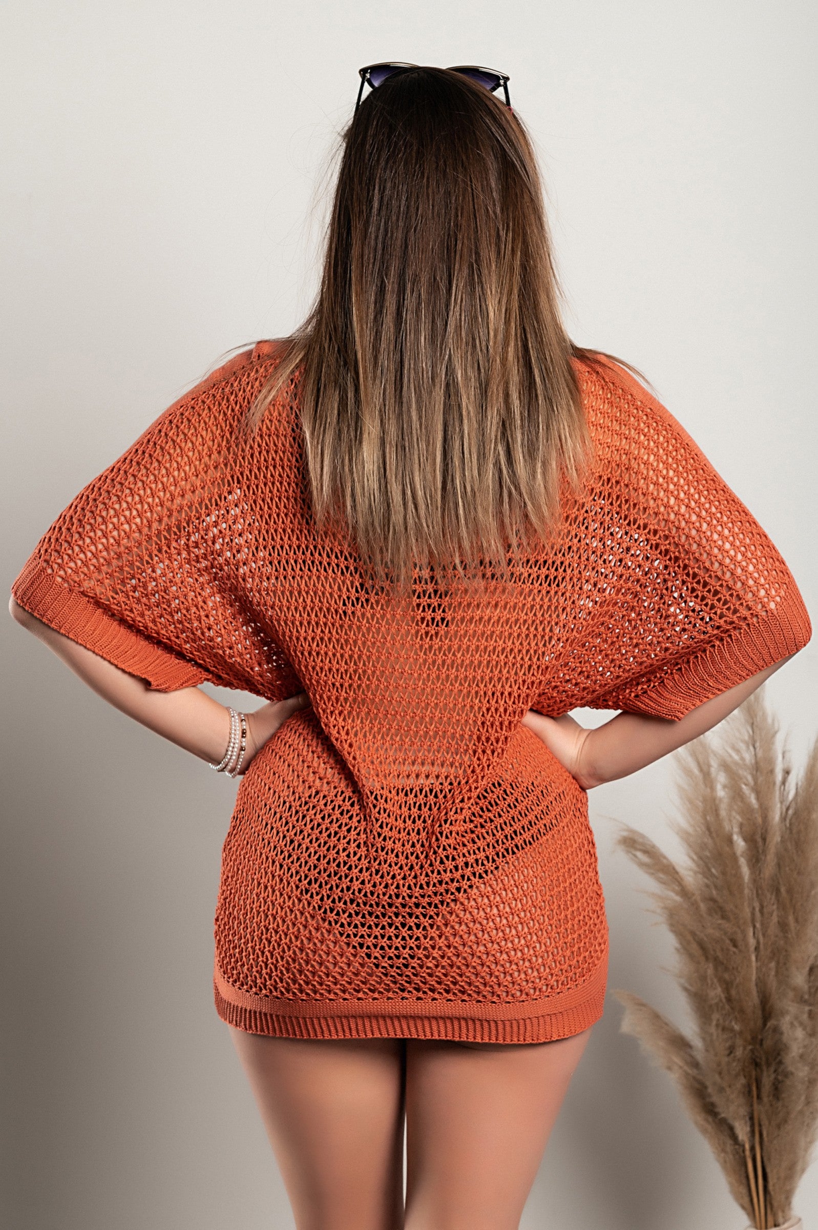 Ohlapna pletena tunika in coral color, showcasing its loose fit, short sleeves, and wide neckline, made in Italy.